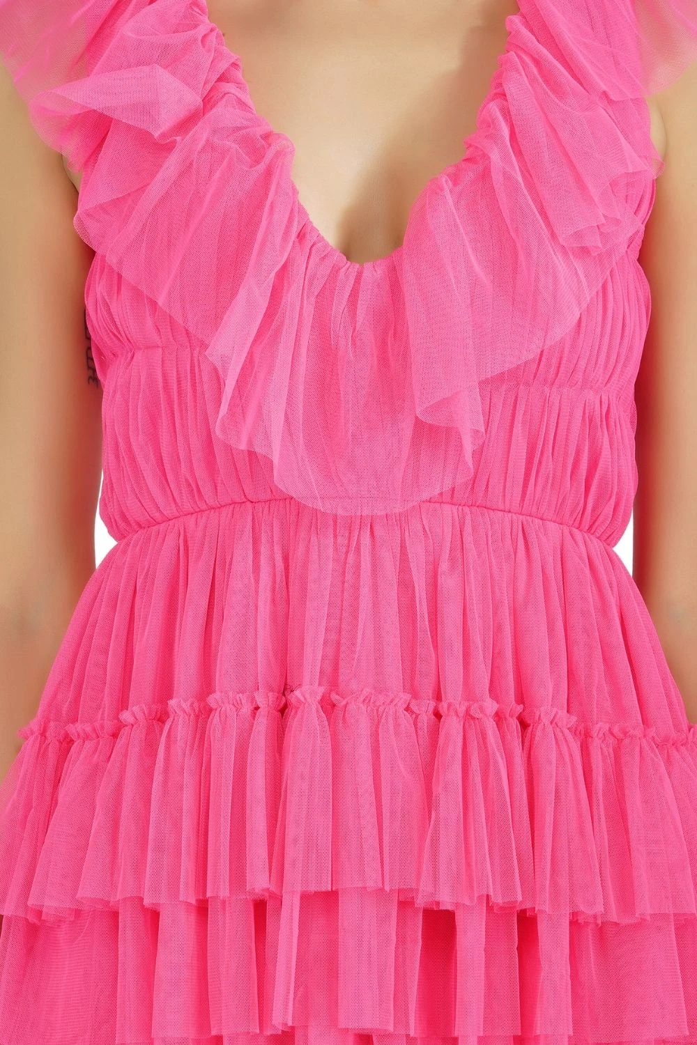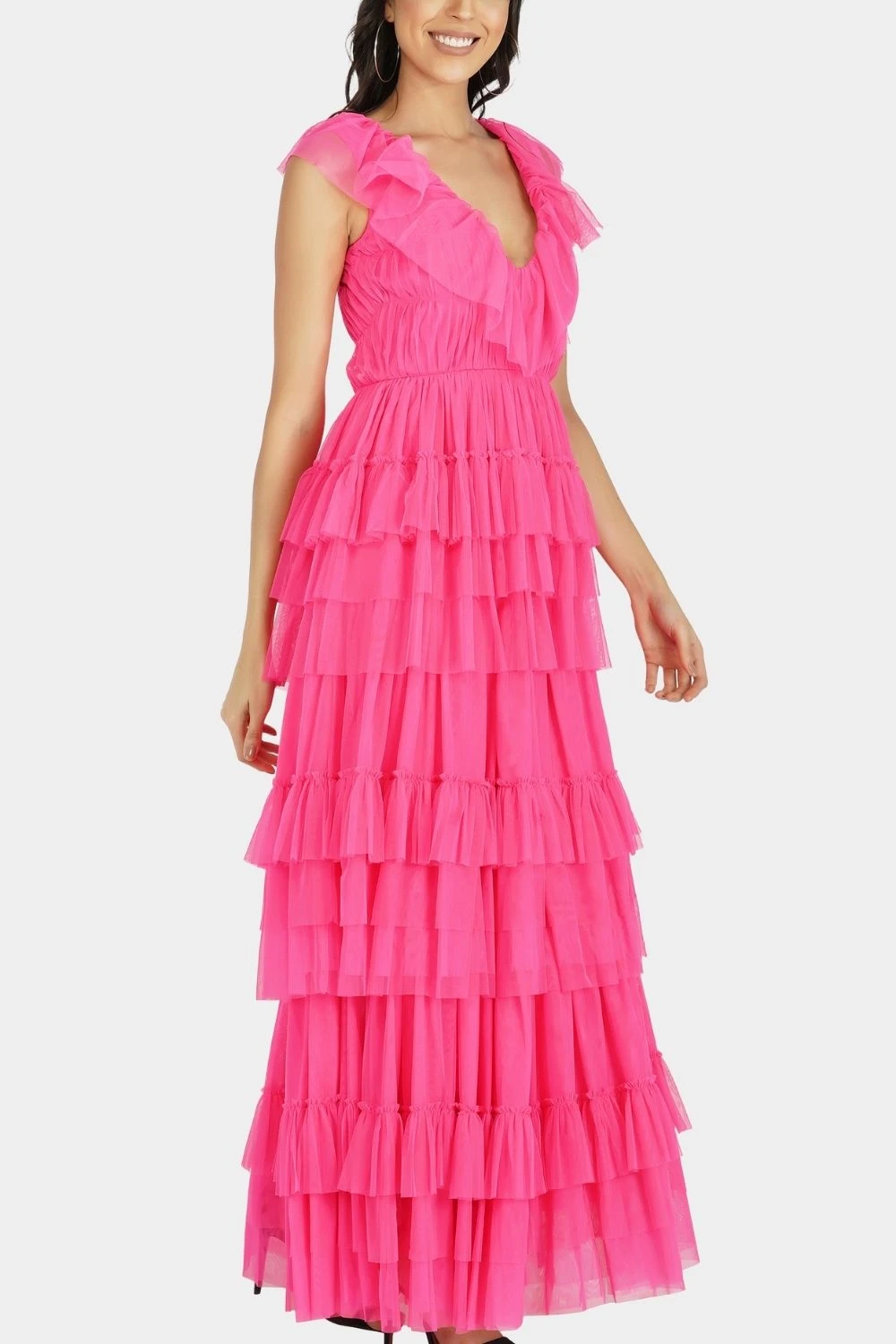 Lace & Beads Alexandra mesh maxi in fuchsia pink with a flattering v neckline and fitted waist. Gorgeous tiered tulle design with ruffle detailing. The perfect dress to grab your attention.