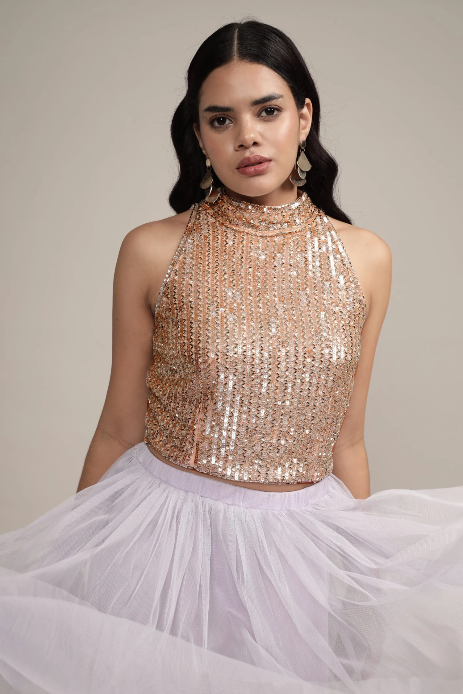 Lace & Beads Beetle Embellished High Neck Top in Pink. Shine bright at any event with this dazzling rose gold sequin top, perfect for party or evening wear. Featuring a high-neck design and all-over shimmering sequins, this sleeveless cropped piece combines glamour and elegance effortlessly. With a soft lining for comfort and a modern fit, it pairs beautifully with tulle skirts or tailored trousers to create a show-stopping look.
