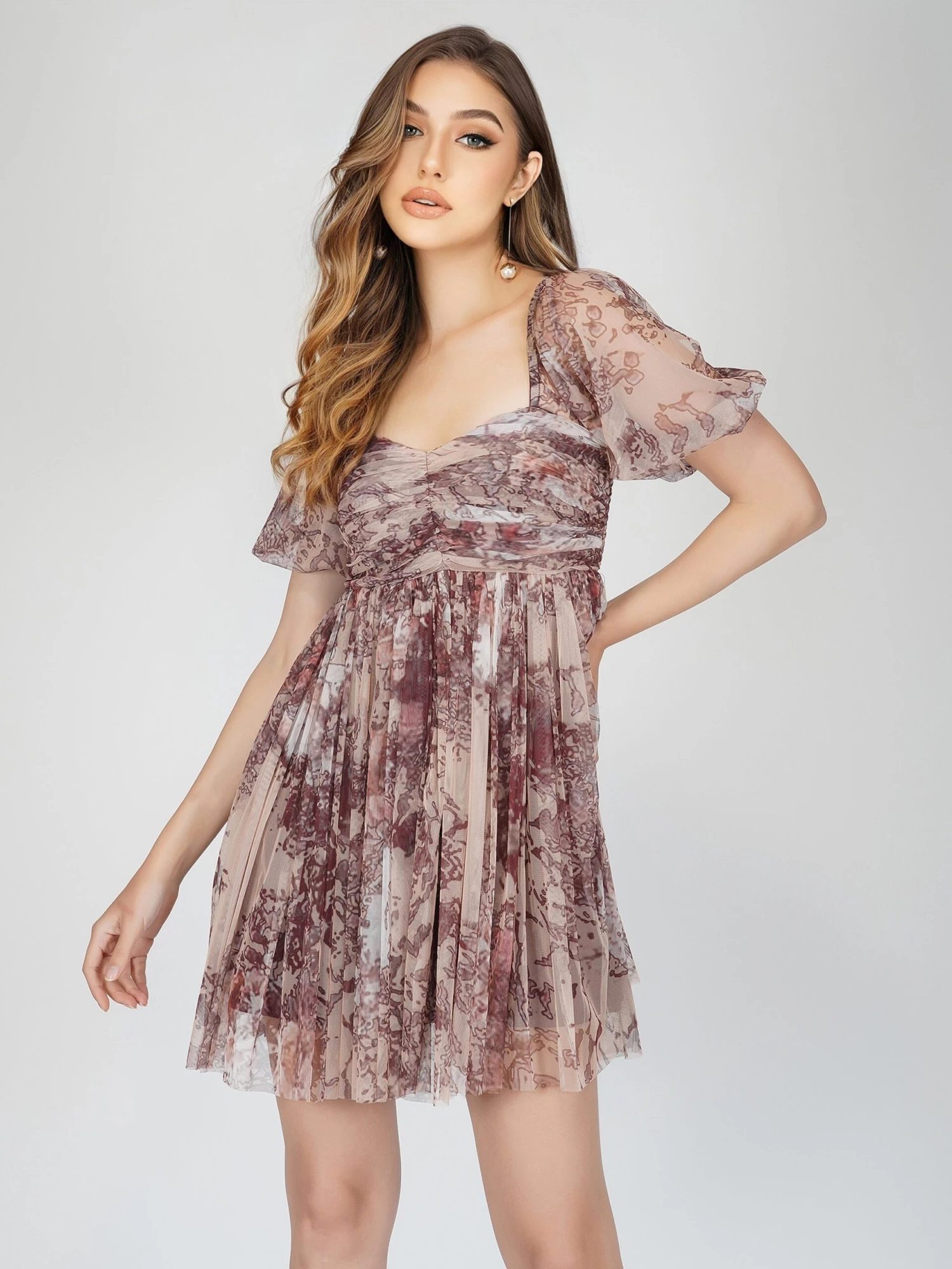 Lace & Beads Brielle printed tulle mini dress. This puff sleeve tulle mini dress features a neutral print throughout, a ruched top and a shirred back for a comfortable fit. The fitted bust and flowy skirt give a beautiful silhouette and the puff sleeves create an utterly romantic look. This tulle sweetheart dress is a style you’ll wear throughout the year, pair it with boots and a jacket for the colder months, or heels and a statement bag for a perfect summer occasion style.