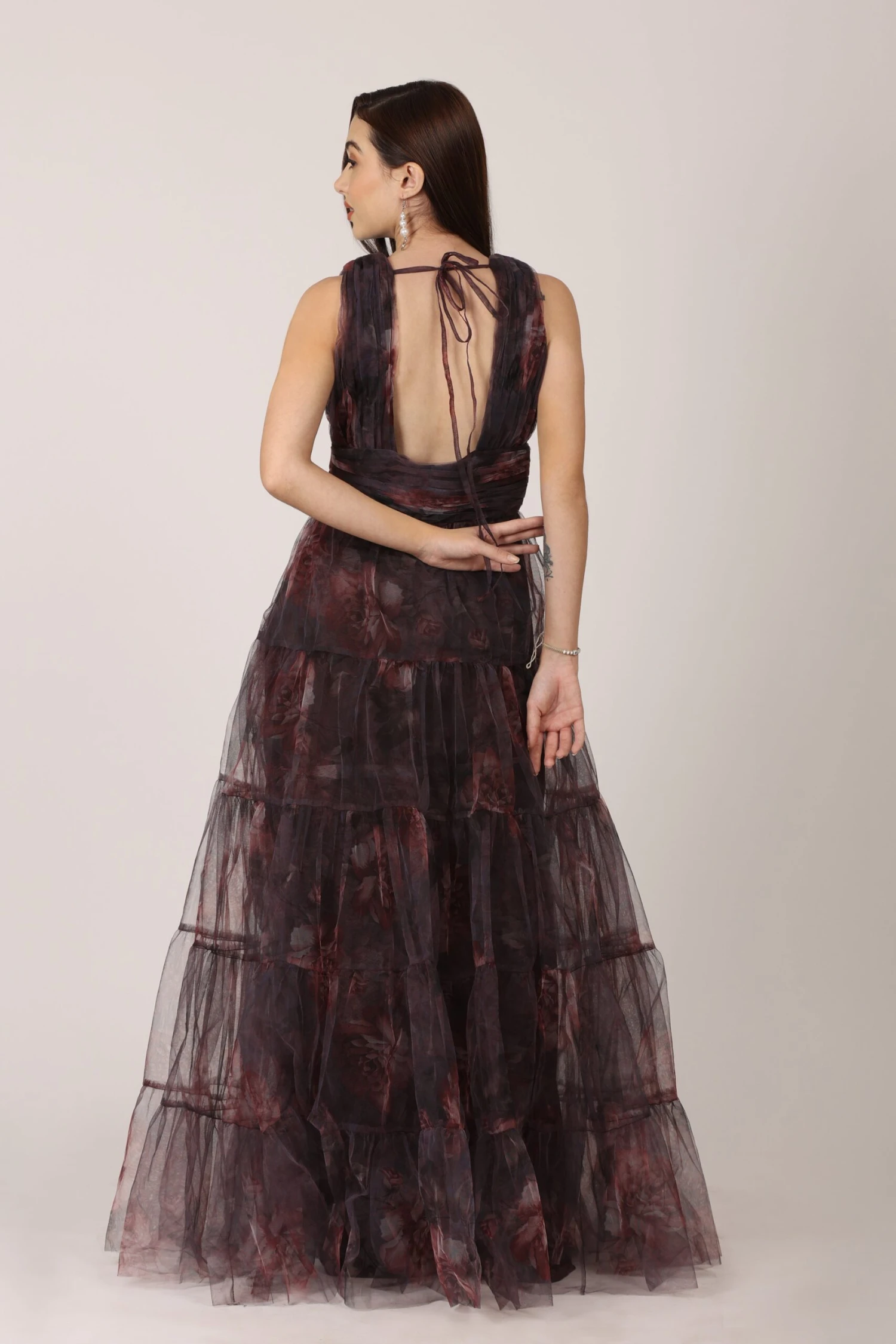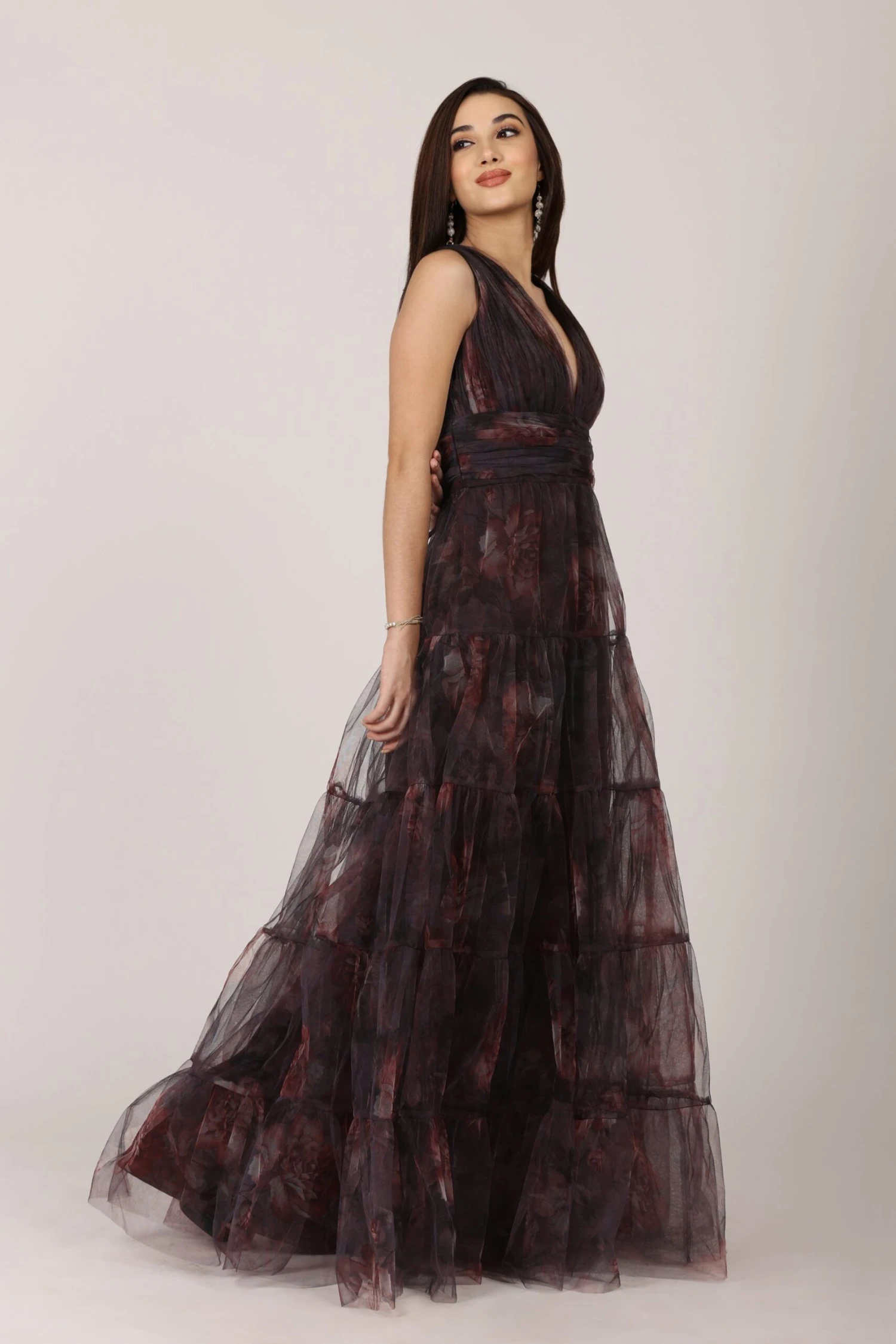 Lace & Beads Candace Maxi Dress in Plum Floral. This floaty and elegant floral occasion dress is perfect for that upcoming wedding or gala, this special occasion gown features v-neckline, a tiered tulle skirt and an alluring open back.
