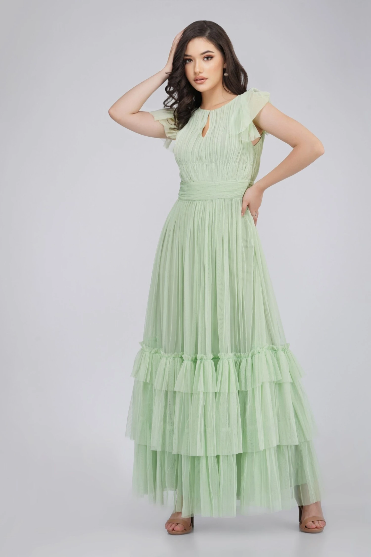 Get ready to make an entrance with this sage green maxi dress, the layered skirt creating a dreamy and ethereal look that’s perfect for a fairy-tale wedding.