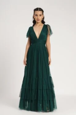 Lace & Beads Gloria sage green evening gown. Make your entrance with the stunning hand-embellished beaded maxi dress that features all-over sage green sequins, a v-neckline, and a flattering silhouette. This dreamy sage green gown has a front side slit and a zip-back closure and is the perfect special occasionwear dress. Whether you are looking for a sage green bridesmaid dress, a dusty sage wedding guest dress, or a party dress, this is the dress to have!