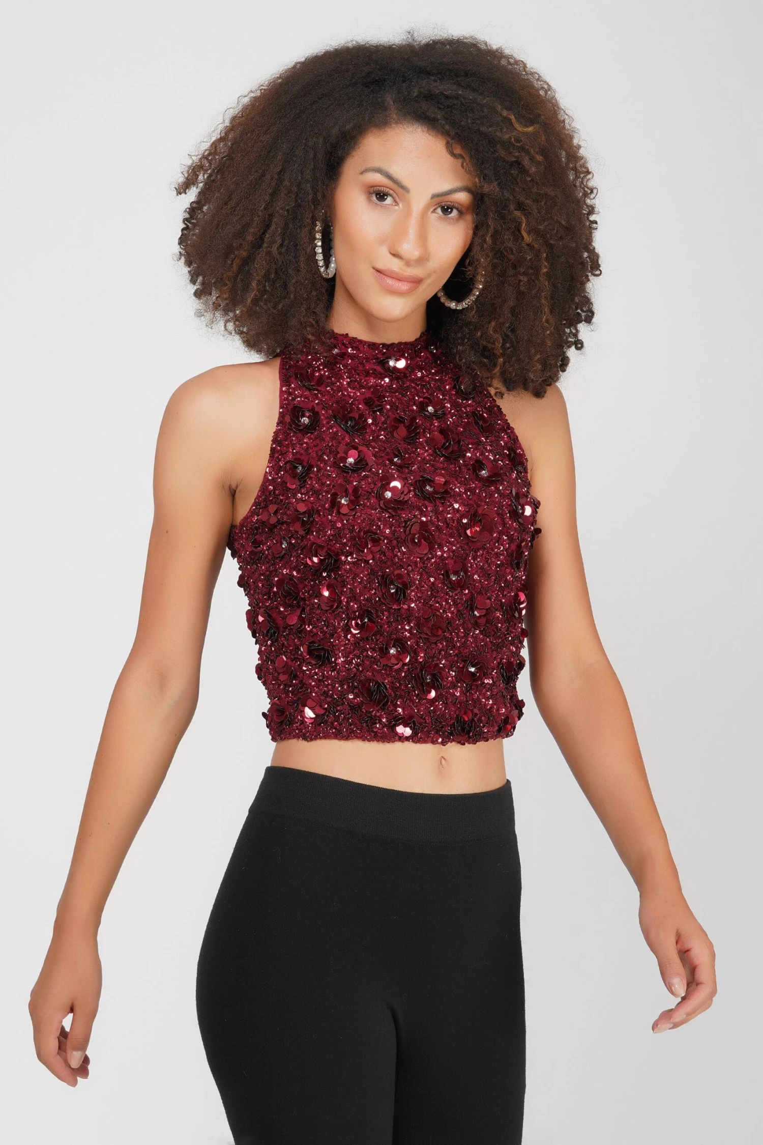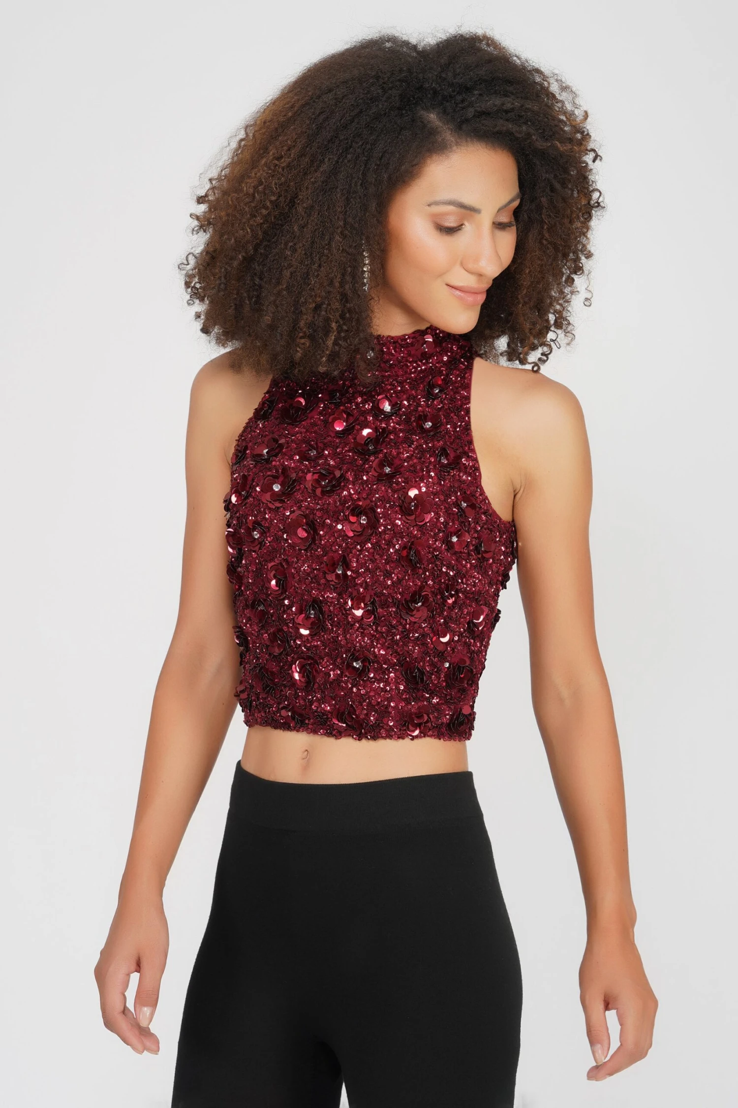 Lace & Beads Gui burgundy beaded top hand-embellished with gorgeous 3D floral sequins. This dark red sequin top features a high neck and zip-back closure. Add this sequin crop top to your wardrobe for a gorgeous evening look or for a less formal look add some sparkle to your next night out and dress it down by pairing it with some leather bottoms. Or turn it into a beautiful bridesmaid crop top by pairing it with our tulle skirts.