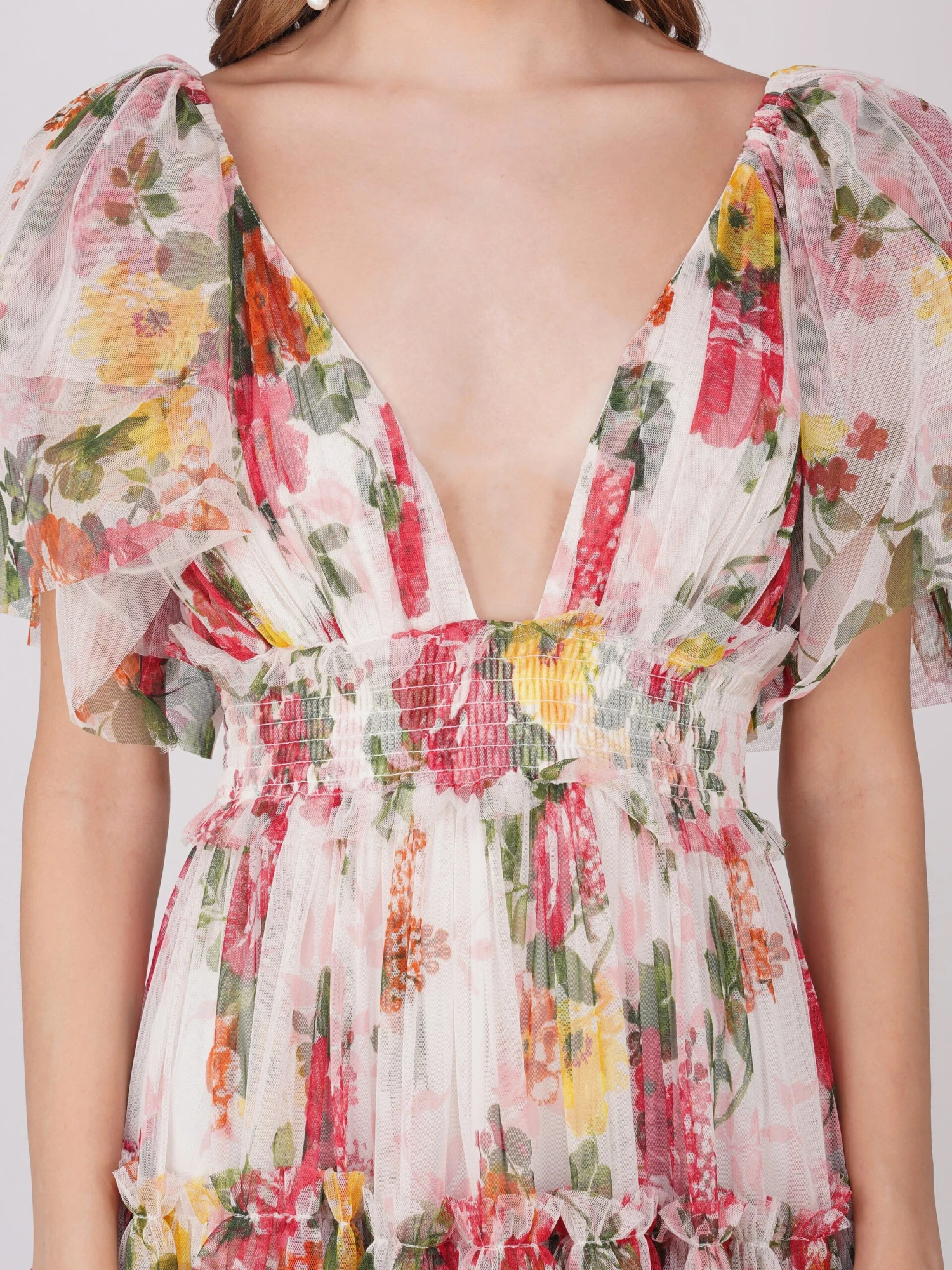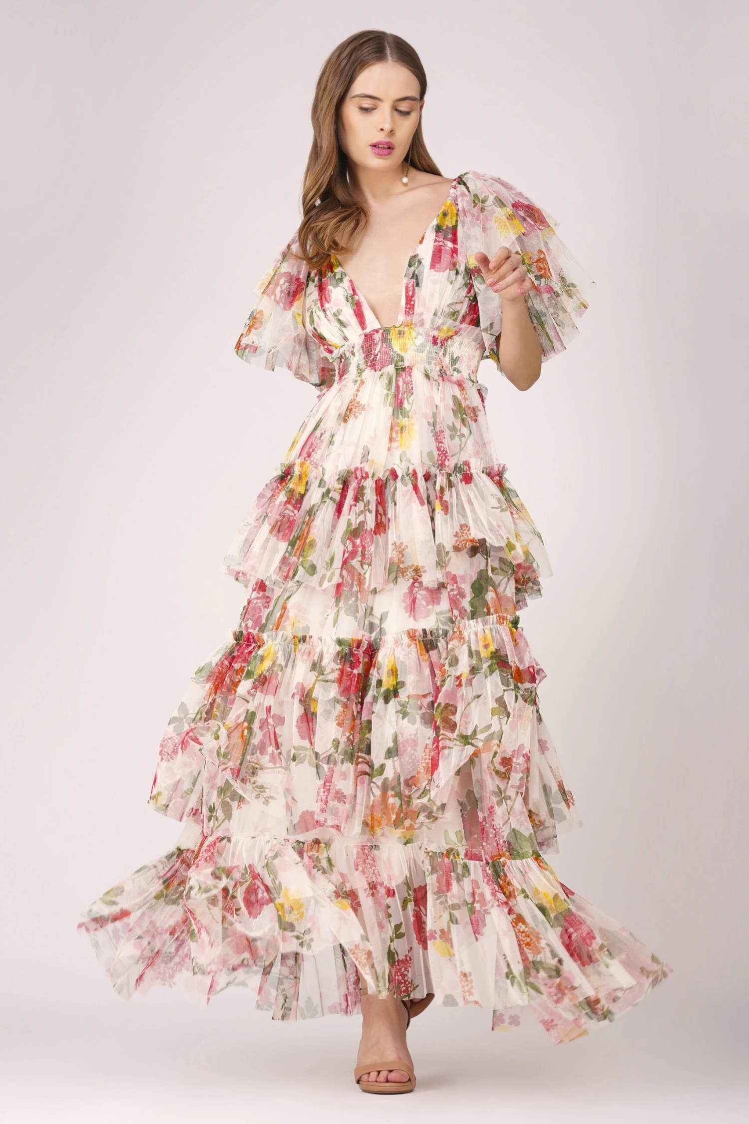 Lace & Beads Jasmine Maxi Dress in Floral Print. This floral dress features a deep v-neckline top that meets at a cinched waist and flows into a beautifully tiered skirt. This dress is created with a soft tulle that flows as you walk. It is finished with sheer waterfall sleeves for an elegant look.Â