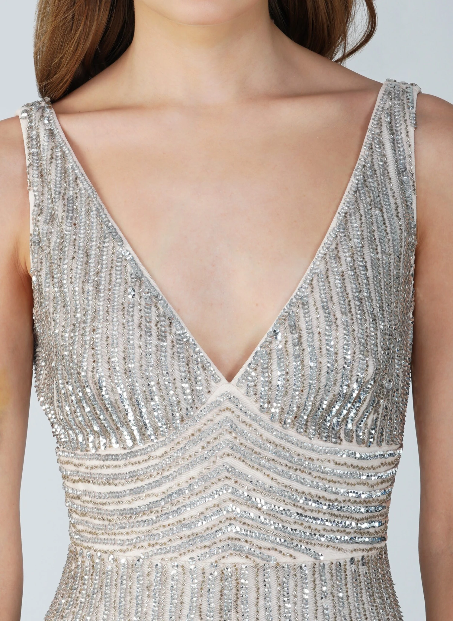 Elevate your occasionwear wardrobe with this blush pink occasionwear dress. Its exquisite bead embellishments, timeless silhouette, and dreamy blush color make it an exceptional choice any special occasion.