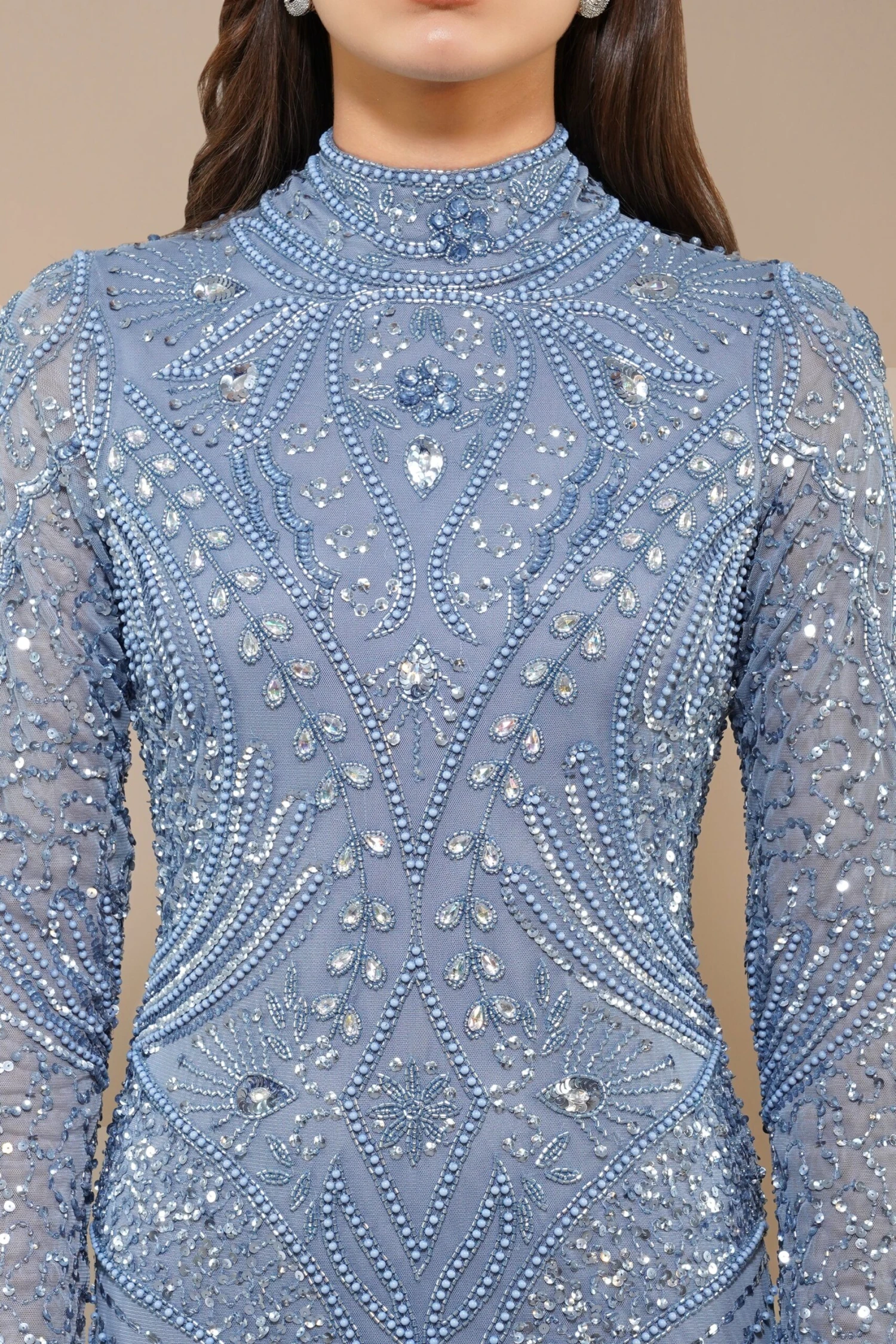 Lace & Beads Lotus Maxi Dress in Light Blue. This gown is the definition of dreamy. With its soft pastel color and all-over shimmer, it’s perfect for when you want to make an impression. The fitted design, high neckline, and long sleeves give it a sleek and classy vibe, while the intricate beadwork makes it feel super special. Whether it’s a wedding, a fancy party, or a big night out, this dress has got you covered. Just throw on some heels and your favorite earrings, and you’re good to go!
