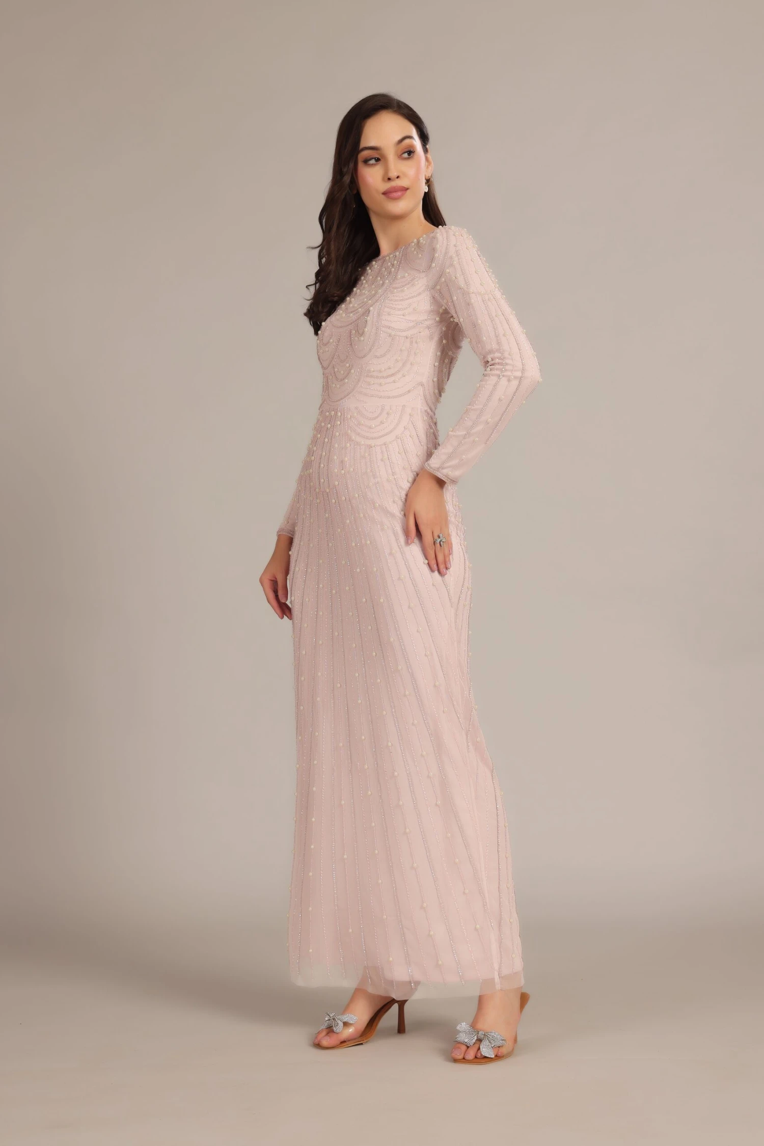 The Lace & Beads Mabel Embellished Maxi Dress in Powder Pink is a perfect blend of elegance and modesty, ideal for special occasions like weddings, galas, or formal evening events. Featuring a high round neckline and long sleeves, it offers a refined, timeless silhouette. The dress is beautifully adorned with delicate pearl embellishments, adding a touch of luxury and shimmer to the design. A fitted waistline enhances the figure, while the flowing skirt creates graceful movement. Pair it with subtle heels and minimal jewelry to allow the intricate pearl detailing to take center stage.