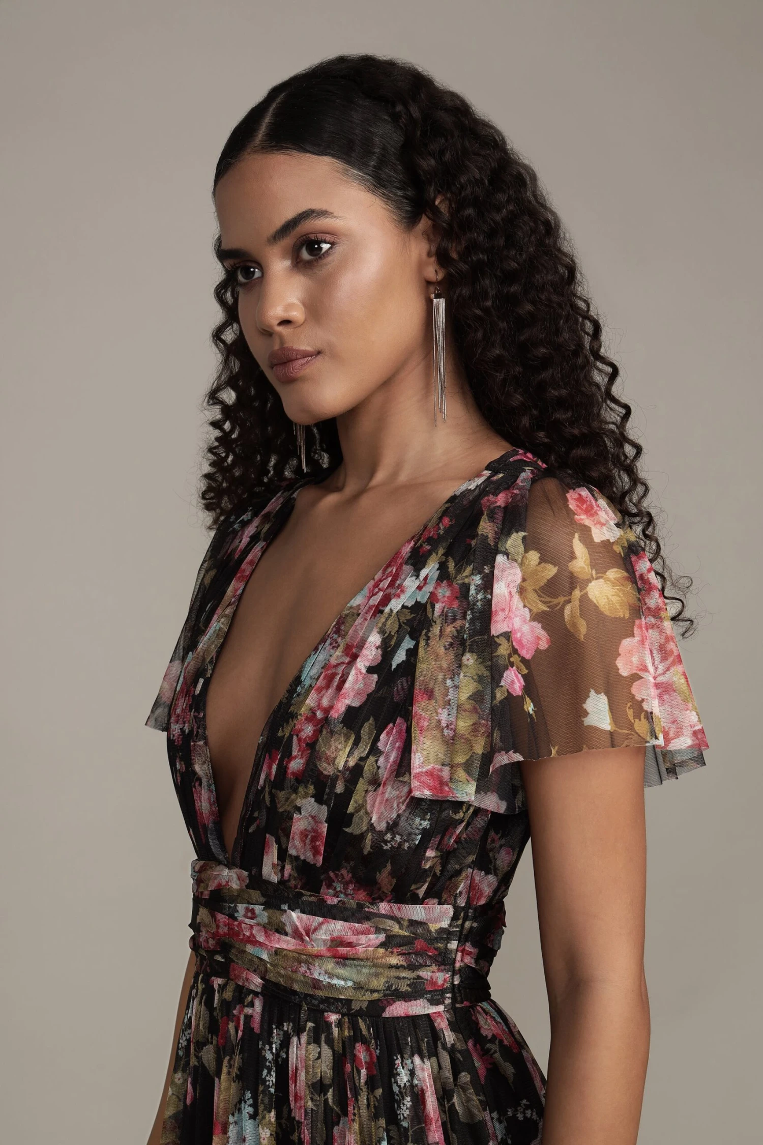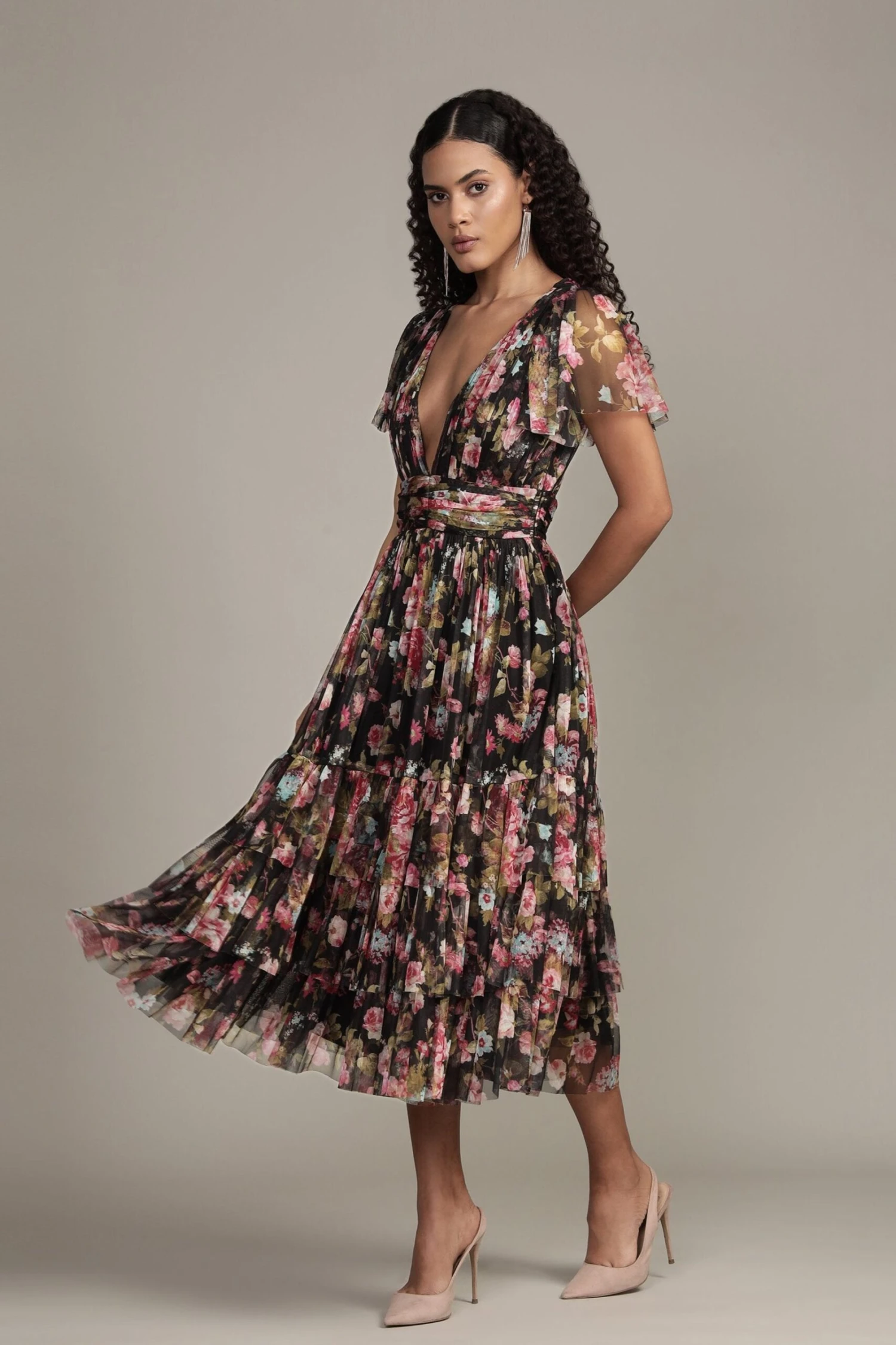 Lace & Beads Madison black floral tulle midi dress. This floral midi dress features a deep v-neckline top that meets at a ruched waist and flows into a beautifully layered skirt. This A-line dress is created with a soft tulle that flows as you walk. It is finished with sheer waterfall sleeves for an elegant look.