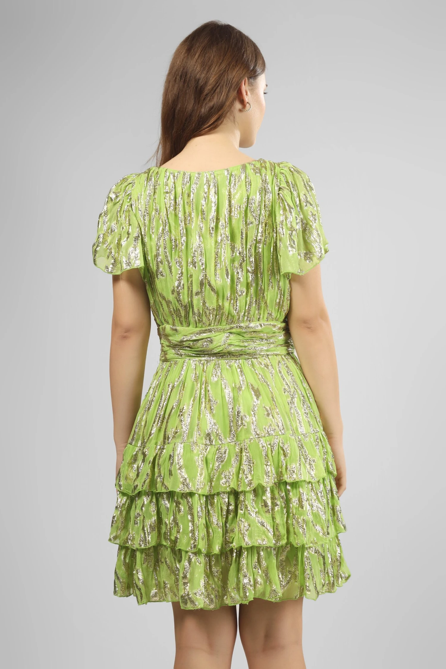 Lace & Beads Madison green printed mini dress. A green mini dress that features a deep v-neckline top that meets at a ruched waist and flows into a beautifully layered skirt. This a-line green dress is created in a beautifully striking green and metallic print that captures your attention as you walk. It is finished with sheer waterfall sleeves for an elegant look. This metallic green mini dress is perfect if you are looking for a green wedding guest dress or looking to dress your bride squad in cute green bridesmaid dresses. We love this green occasion dress for all your big events. With its complimentary style and flattering colour, you cannot go wrong with this lime green mini dress.