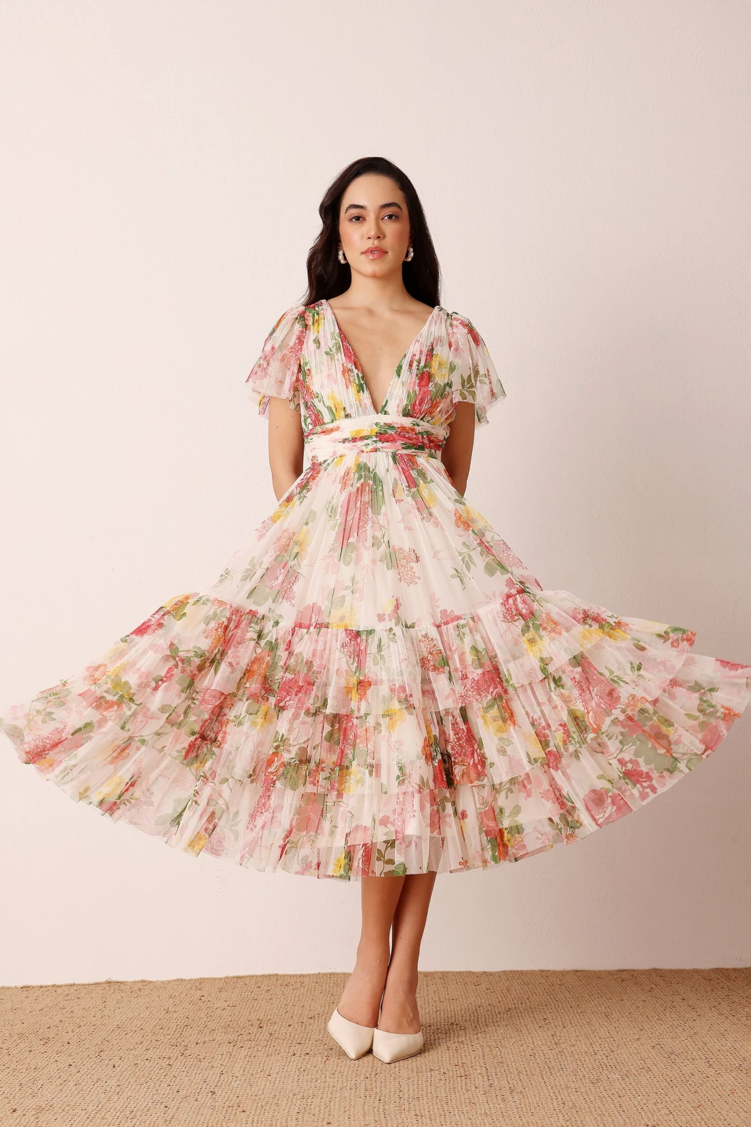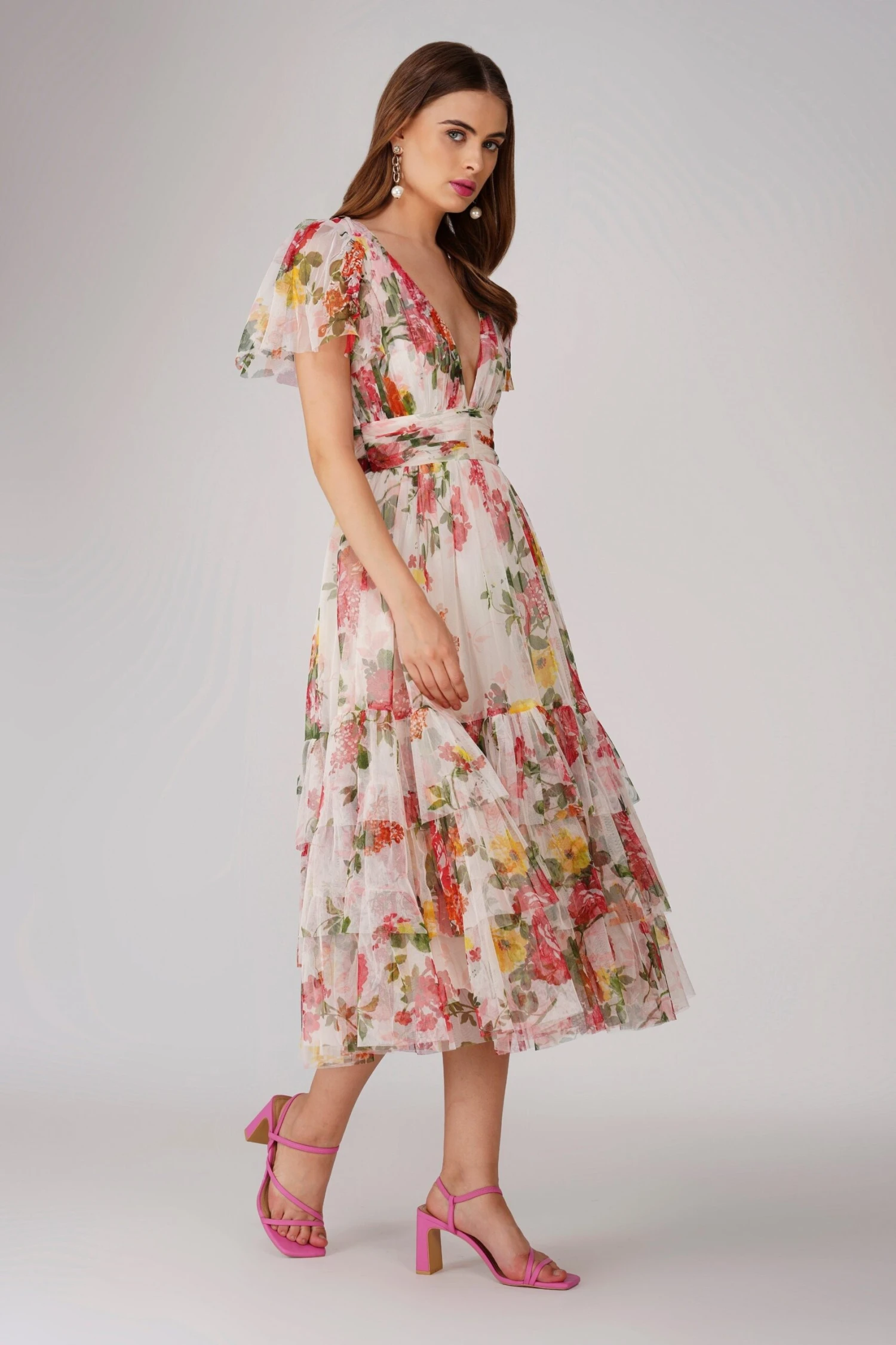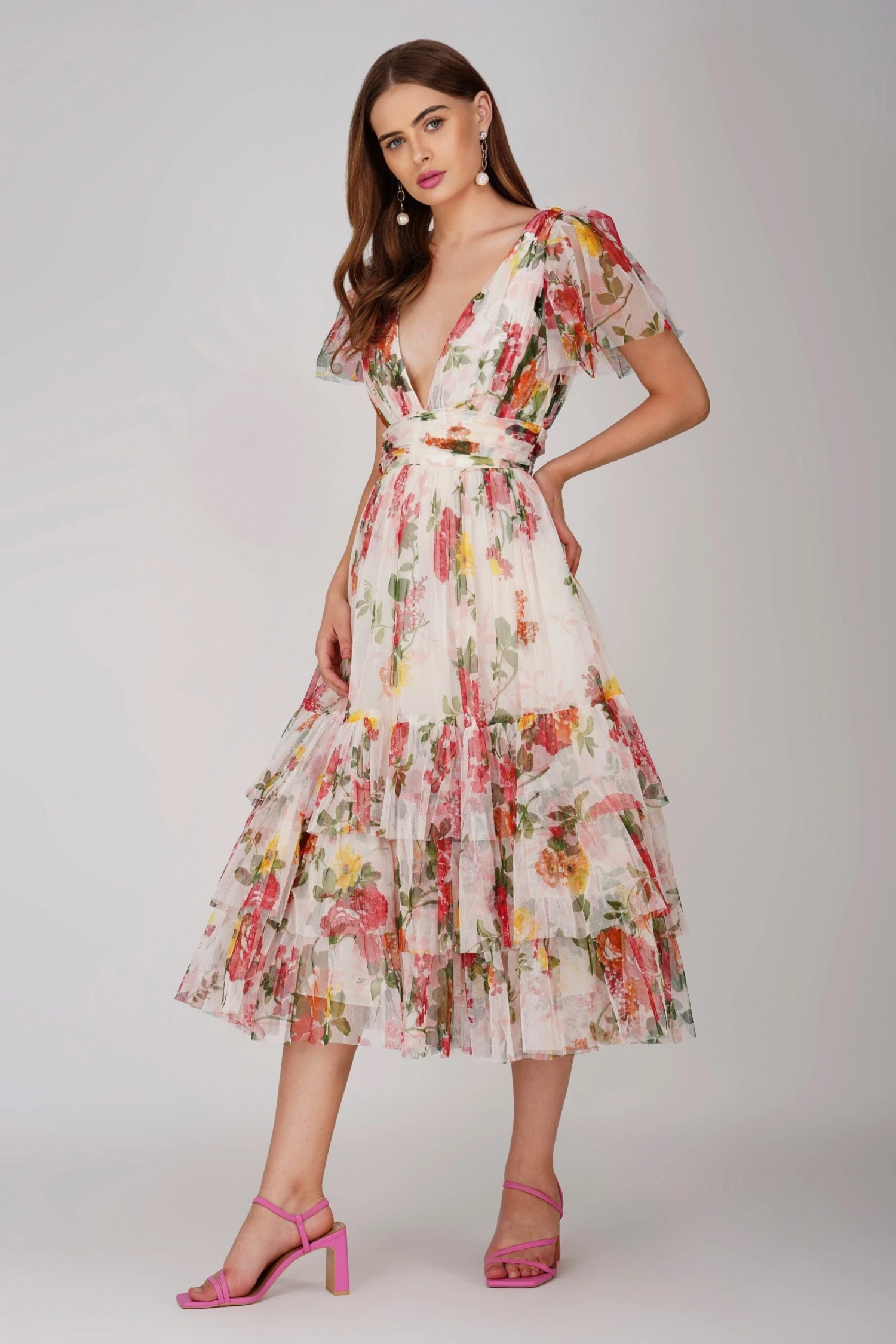 Lace & Beads Madison Tulle Midi Dress in Floral Print. This floral midi dress features a plunging v-neckline top that meets at a ruched waist and flows into a beautifully tiered a-line sskirt. This dress is created with a soft tulle that flows as you walk. It is finished with sheer waterfall sleeves for a timeless look.