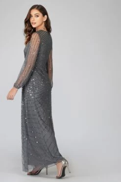 Miya Green Long Sleeve Bridesmaid Dress. For that upcoming special occasion or wedding, this green bridesmaid dress features a wrapped top bodice that flows in an embellished skirt, that is designed with pleated detailing from the waist for a flattering look. This emerald green bridesmaid dress is hand embellished with beads and sequins throughout to create a luxurious and showstopping look.