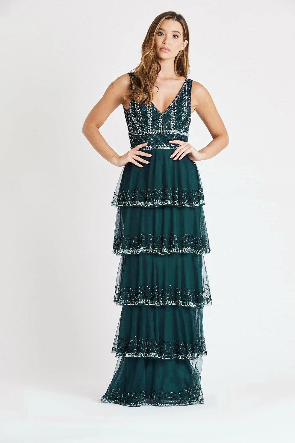 Lace & Beads Mulan Lishly emerald green hand-embellished gown with layered detailing and v-neckline. This gorgeous green evening gown features an accentuated waist and linear beaded top. And absolute statement emerald occasionwear dress, which is sure to give you an entrance.