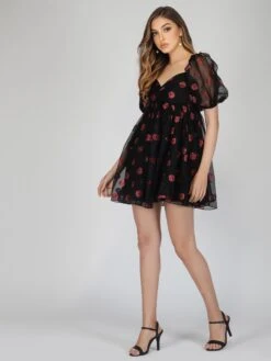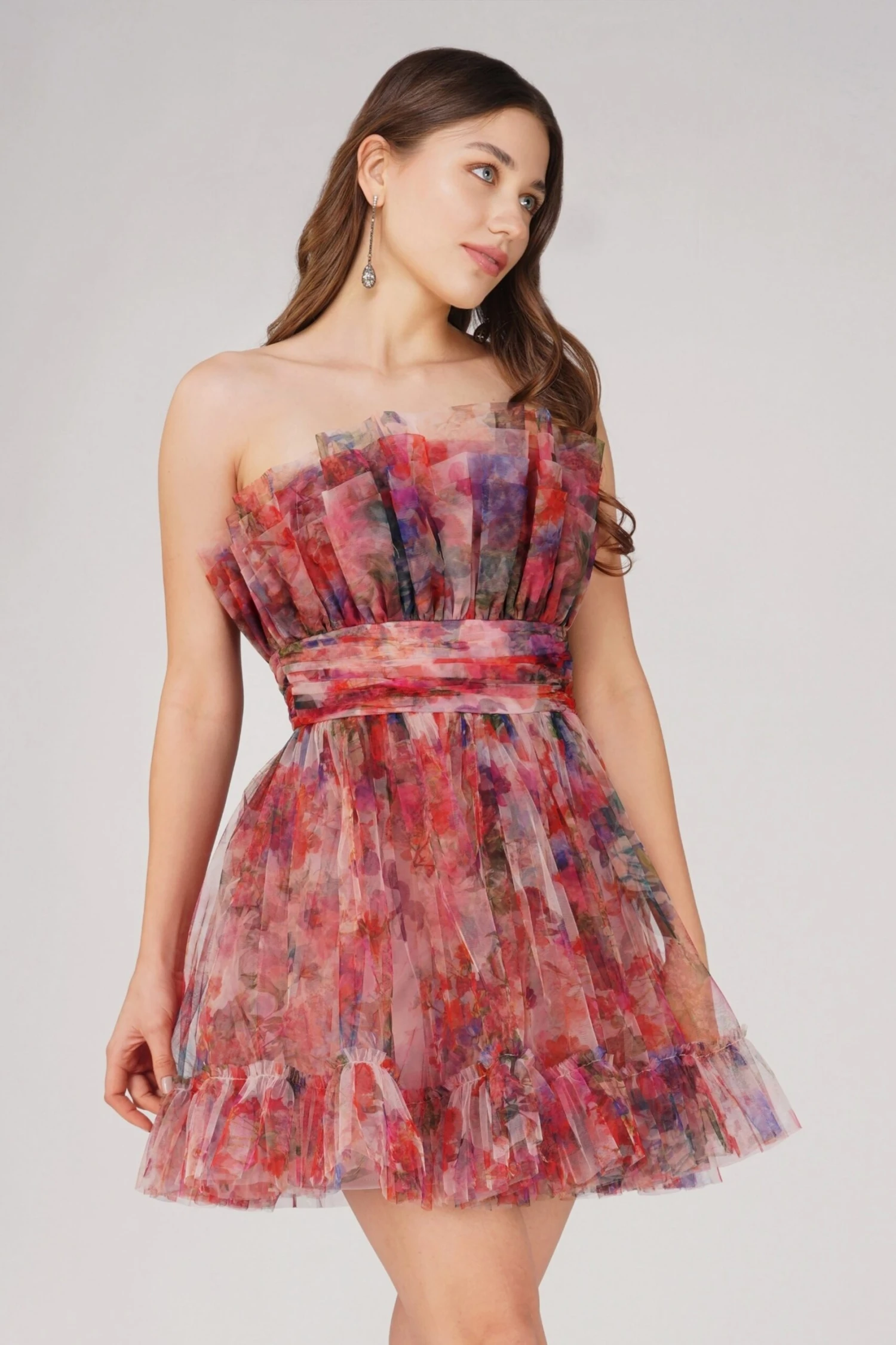 Create a statement with this pink floral tulle mini dress, a true showstopper dress, perfect for a night out on the town, as a birthday dress, or any party. The accentuated waistline enhances your silhouette, and the pink floral print adds a playful touch.
