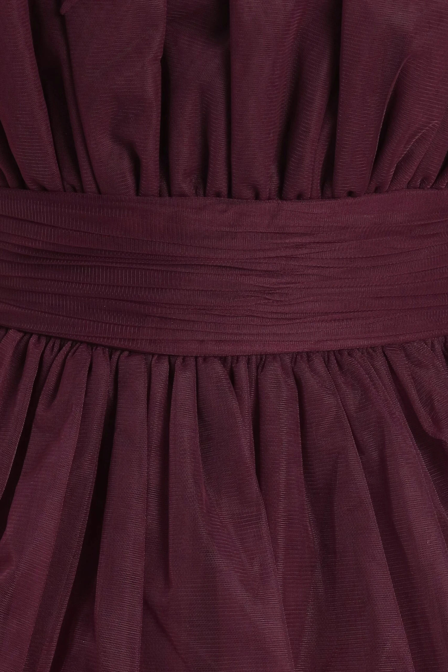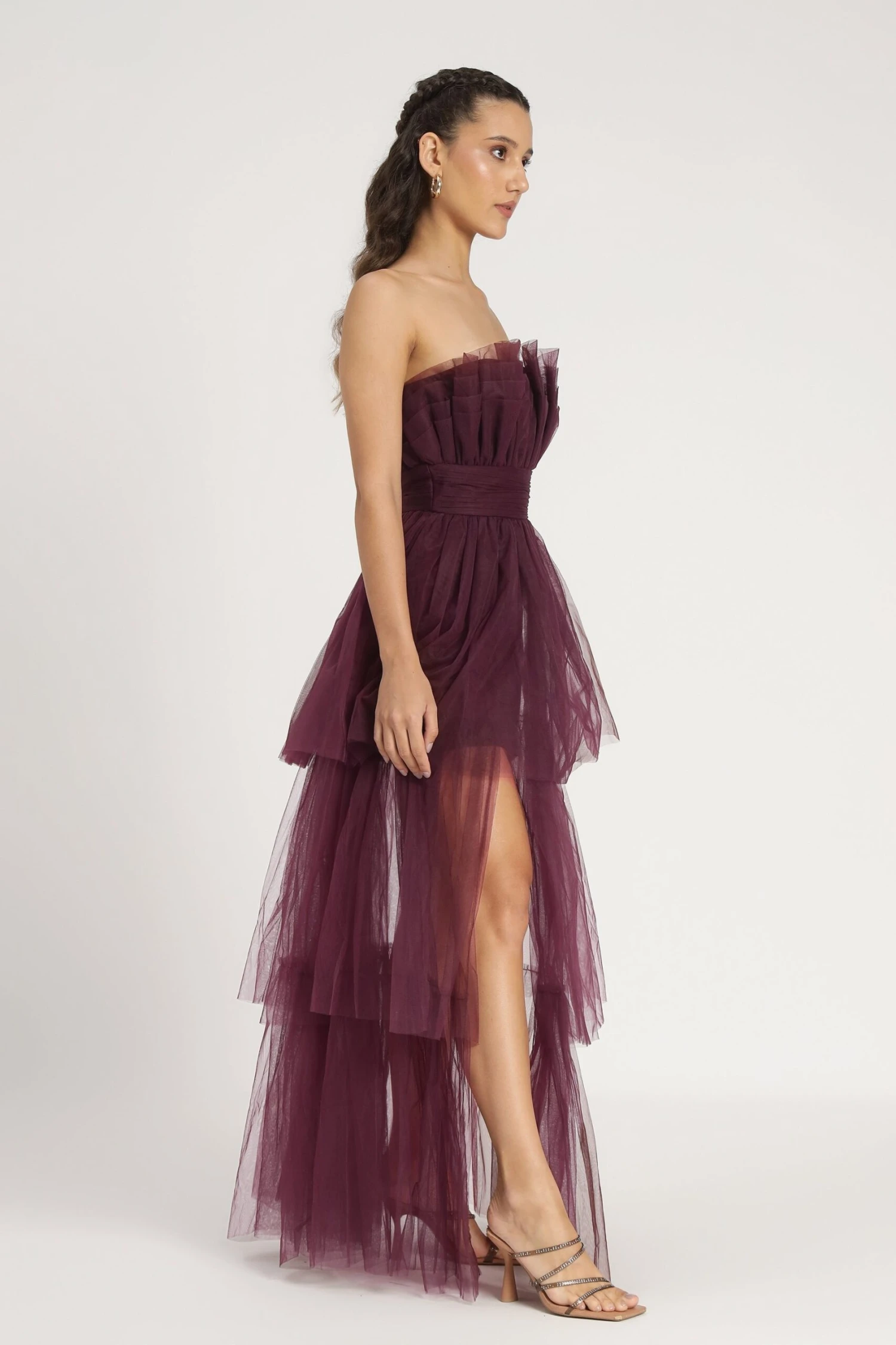 Lace & Beads Natalia Tulle Maxi Dress in Plum. Made from high-quality stiff tulle, this dress is the ultimate statement piece. Featuring a bandeau design, defined waist and an abundance of layered tulle, this dress gives you the look that will turn heads at any event.