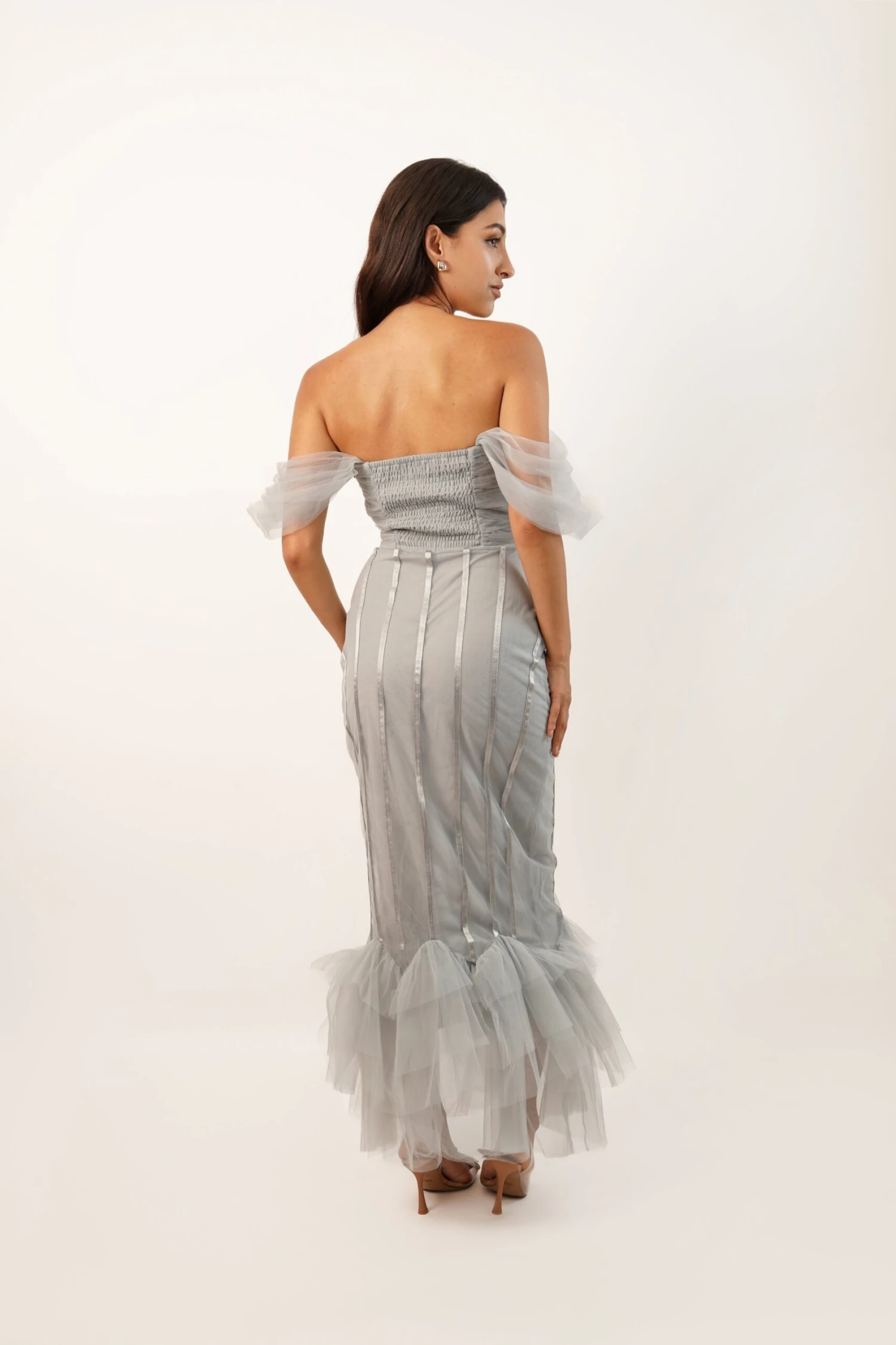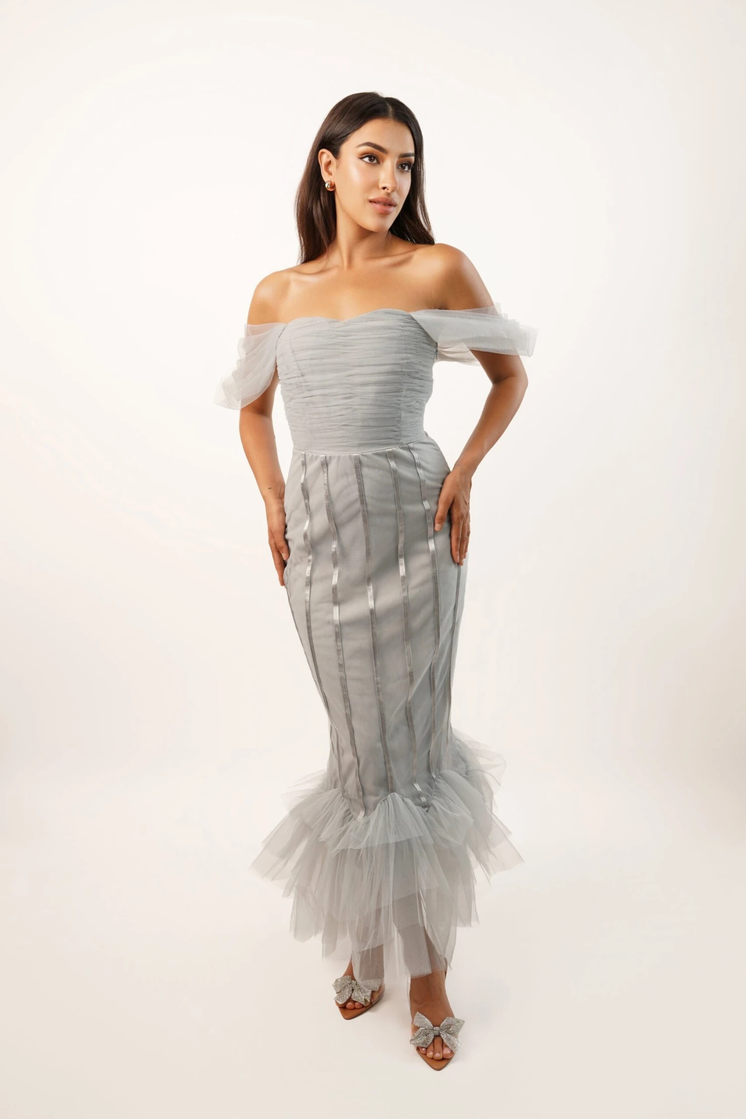 Lace & Beads Neros Dusty Blue tulle corset dress. Step into sophistication with Neros our dusty blue off-shoulder midi dress designed for the modern trendsetter. The ruched top and voluminous tulle at the bottom create a dramatic hem, epitomizing the London fashion scene. The flattering corset illusion on the bodice enhances your silhouette. Perfect for weddings, formal events, or a stylish day out with friends, this dress is a statement piece for the young and chic.