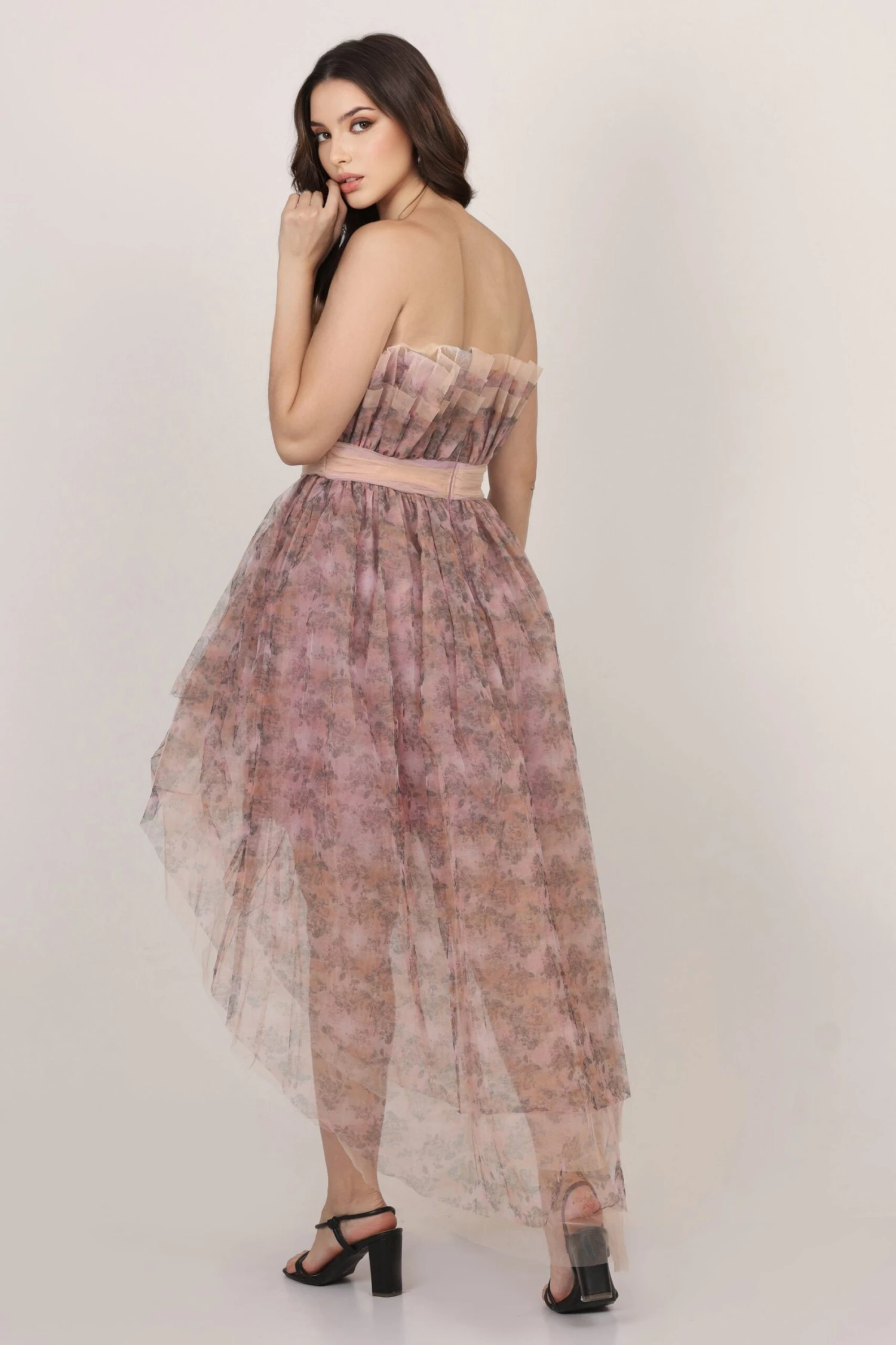 Lace & Beads Nidha High Low Tulle Dress in Floral Print. This strapless dress combines elegance and fun, featuring a high-low hemline and voluminous layers of printed tulle.
