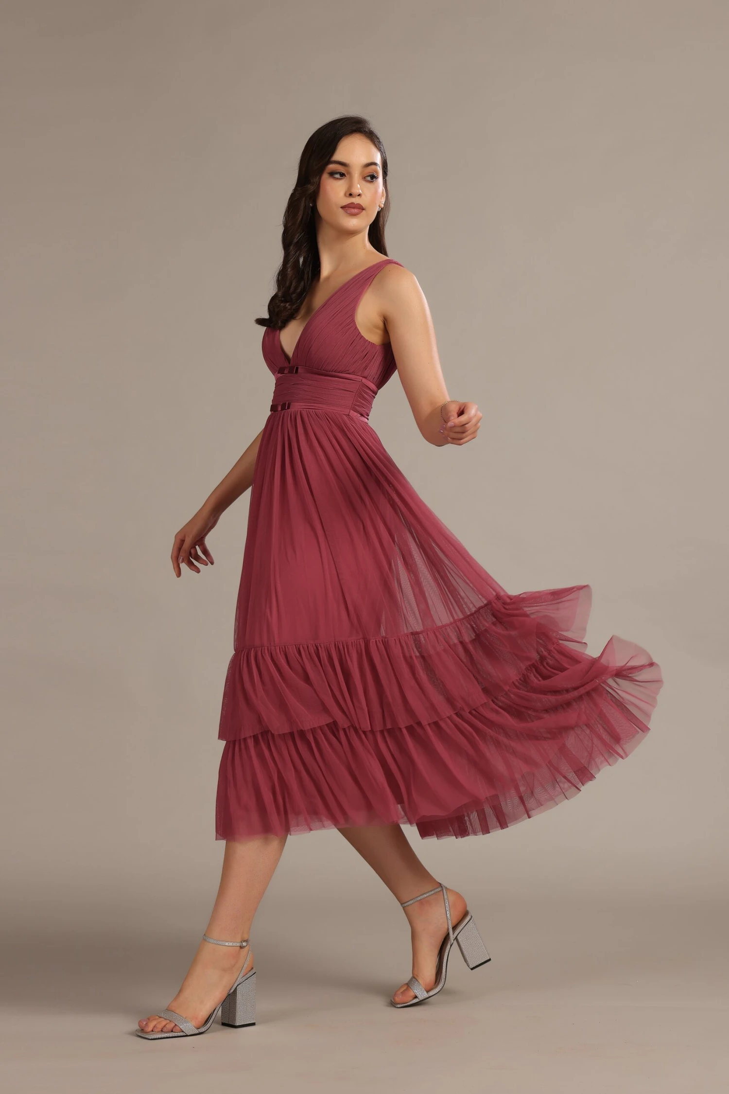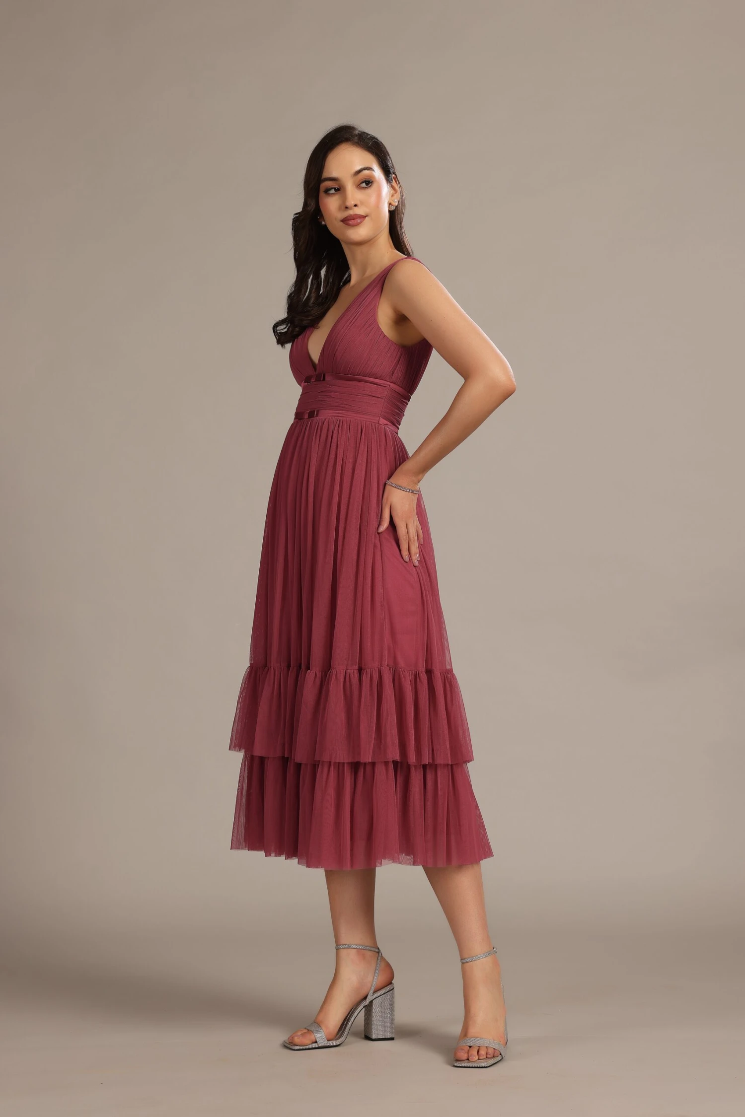 Lace & Beads Nymeria Midaxi Dress in Orchid is a vision of romance and elegance, designed in a dreamy deep pink colour. Featuring a pleated bodice with a V-neckline, this dress cinches at the waist with delicate bow accents for a flattering silhouette. The flowing midaxi-length skirt, crafted from airy tiered tulle, adds graceful movement, making it perfect for special occasions like weddings, proms and garden parties.Â