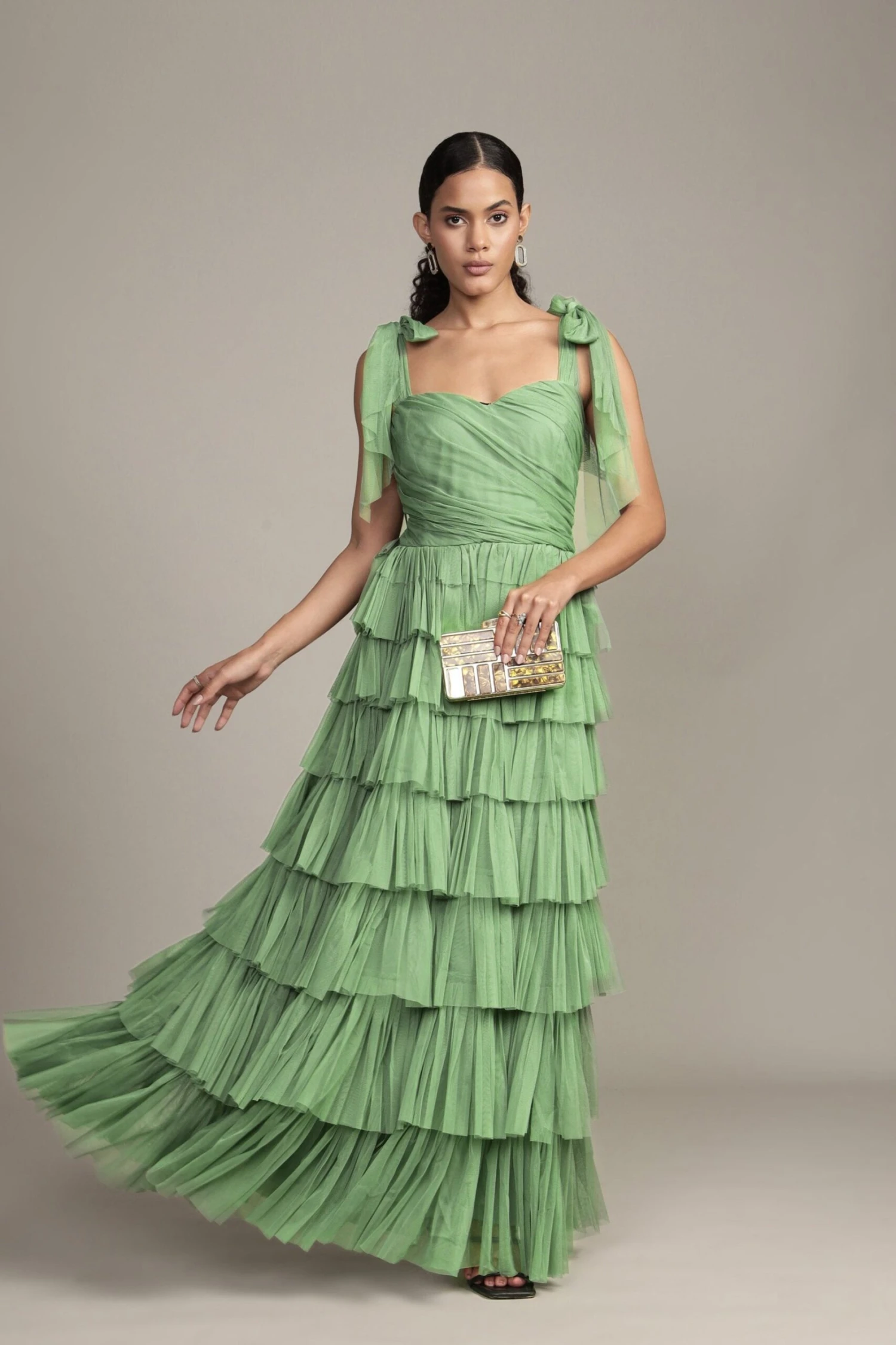 Featuring delicate shoulder ties and a layered skirt design, the Ophelia dress is perfect for special occasions. Whether you’re attending a garden party or a wedding this soft green dress promises to make a captivating statement.