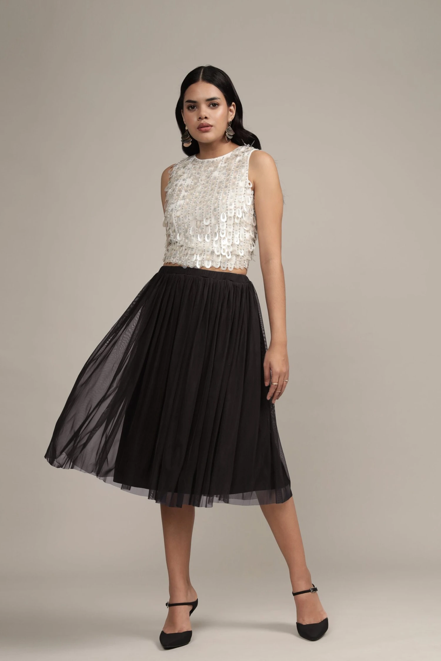 Lace & Beads Peruvian Top in White. Embrace the magic of winter with this whimsical white sequin top, perfect for adding frosty sparkle to your holiday wardrobe. Featuring layers of shimmering, looped sequins reminiscent of icicles, this sleeveless cropped design is both playful and chic. The soft round neckline and comfortable fit make it easy to pair with flowy skirts or tailored trousers, ensuring you dazzle at every winter soirée. Ideal for festive gatherings, this top is your go-to for making every moment feel like a snow-kissed celebration!