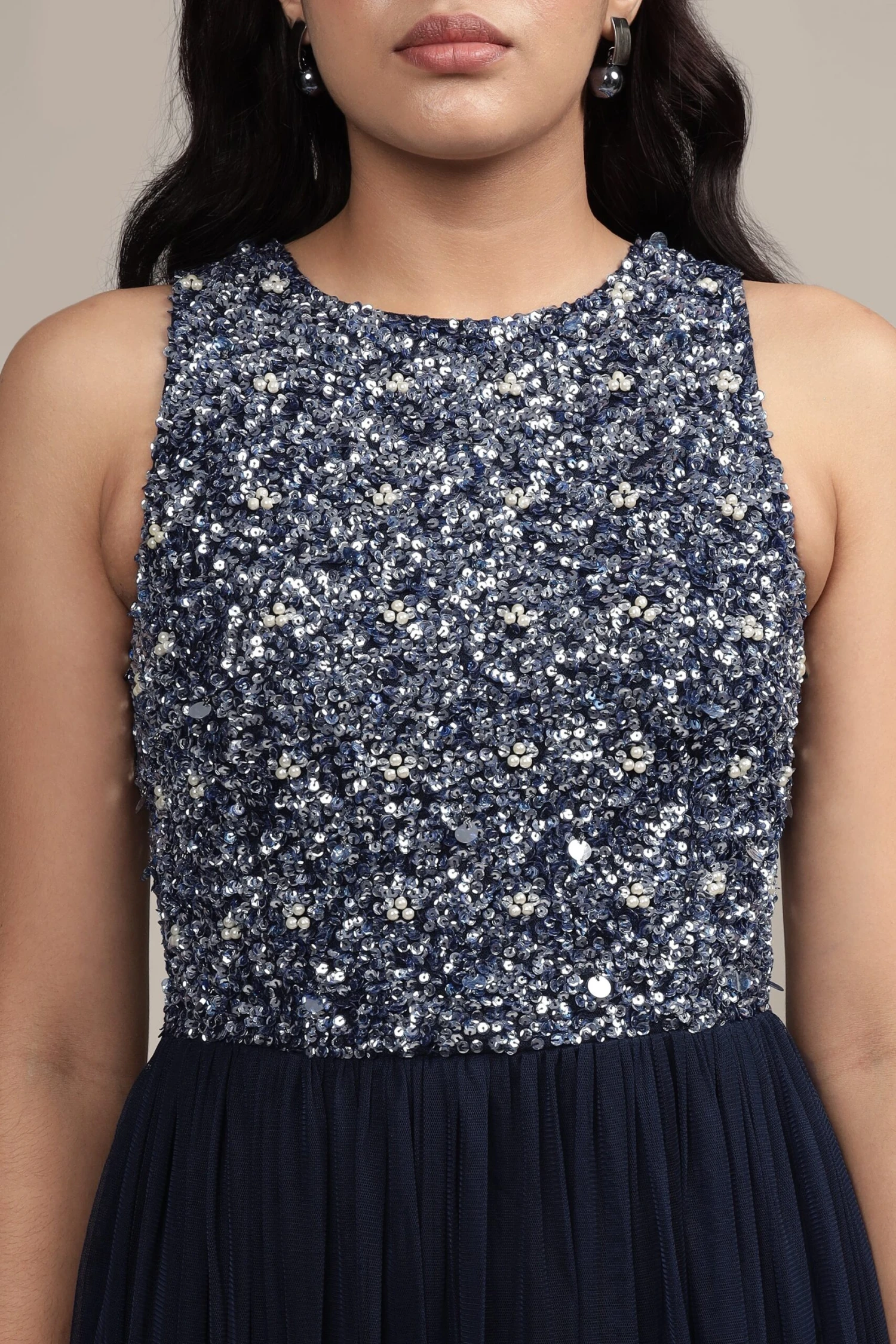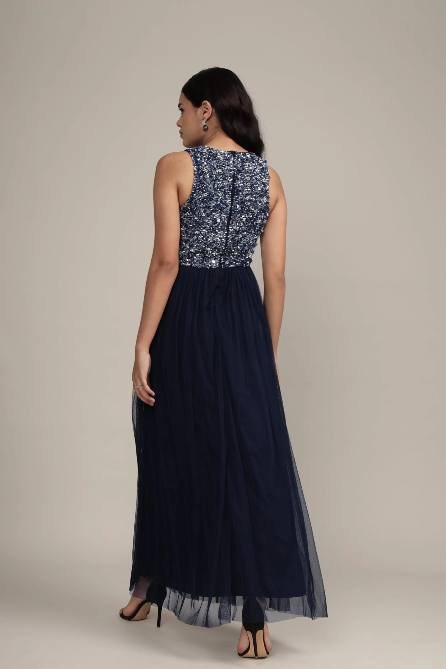 Lace & Beads Picasso Embellished Maxi Dress in Navy with Pearl Beads. Get ready to shine in the Picasso Maxi Dress in navy. The bodice is covered in sparkling sequins and beads that light up any room, making it perfect for special occasions. With its sleeveless design and high neckline, it’s stylish and easy to wear, while the flowy mesh skirt adds a touch of effortless elegance. This dress is all about standing out and feeling amazing.