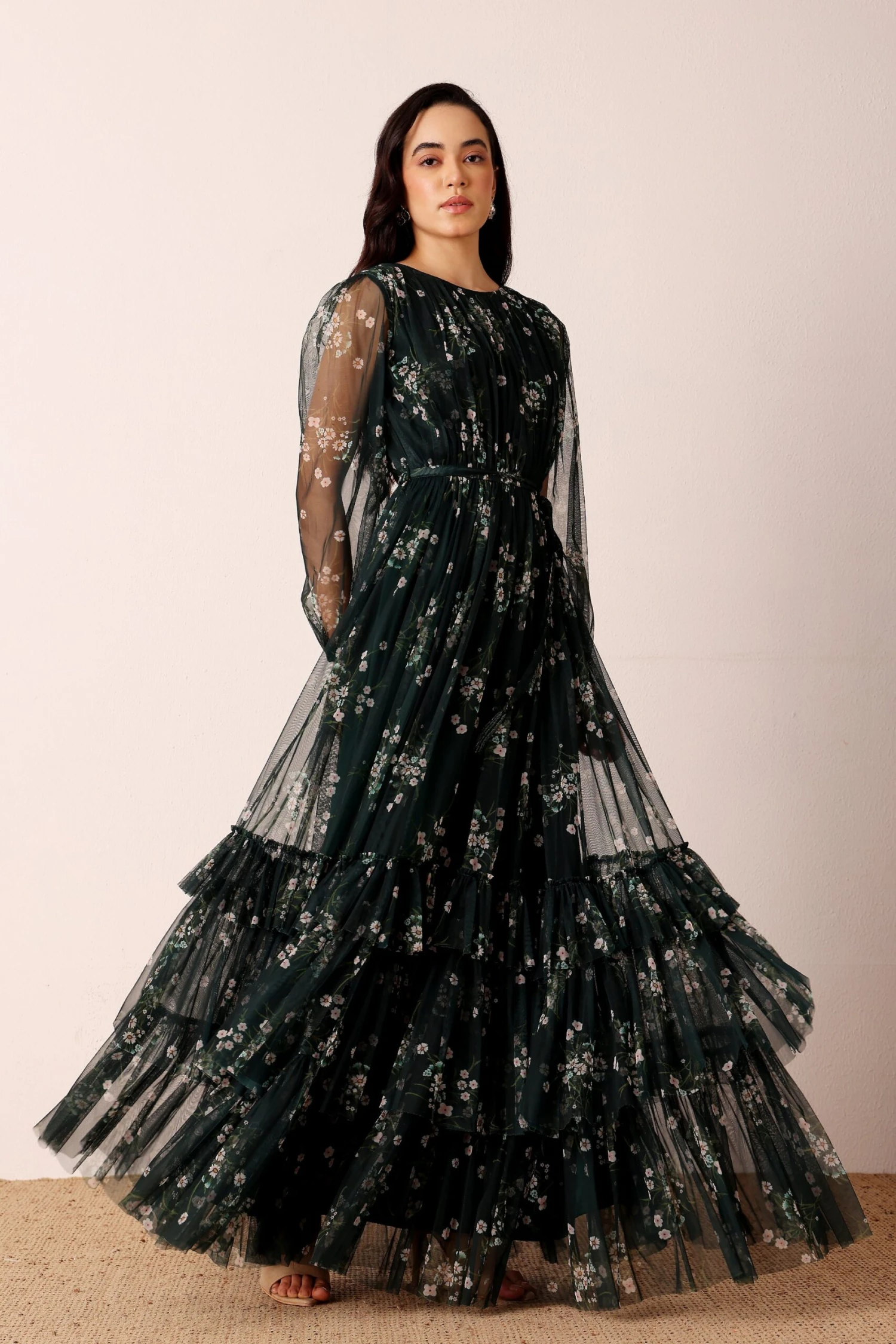 Lace & Beads Rebecca Maxi Dress in Emerald Floral is a stunning long sleeve maxi dress crafted from delicate floral printed tulle in a rich green print. Featuring a pleated bodice, cinched waist, and flowing skirt that sways gracefully with every step, this summery dress blends modesty with ethereal elegance. The discreet keyhole back adds a sophisticated touch, making it the perfect choice for weddings, garden parties, or any special occasion where you want to make a lasting impression.