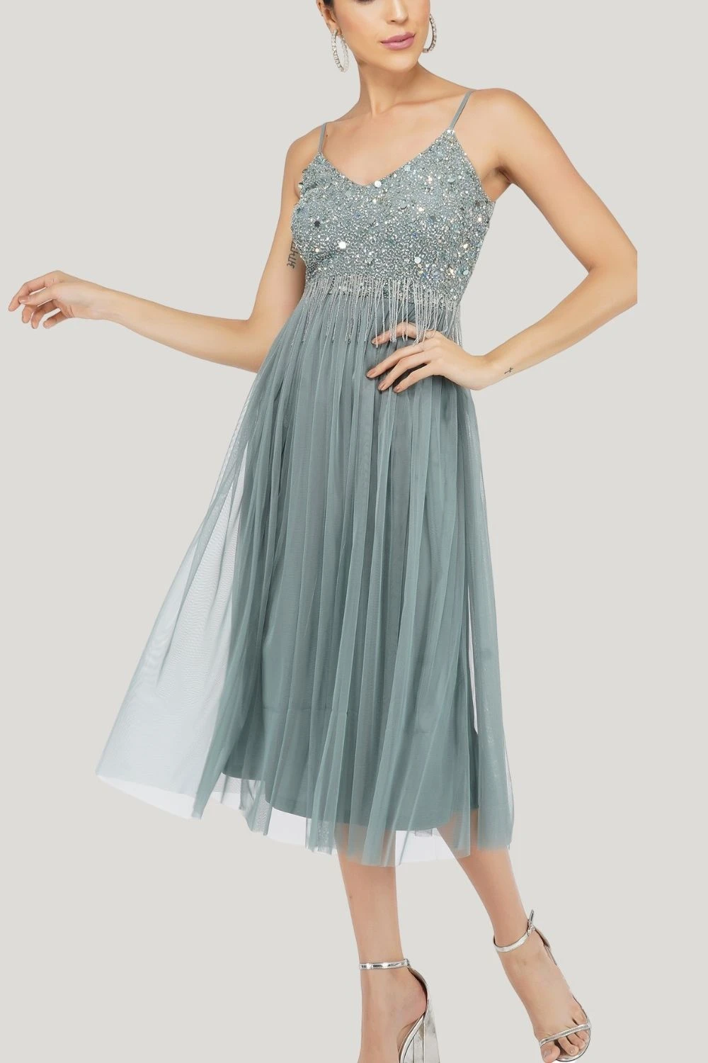 Lace & Beads Riri teal sage bridesmaid midi dress. With beautiful intricately embellished top, v neckline, adjustable straps, tassel detailing, and zip back closure. Making this the perfect bridesmaid dress, wedding guest dress or even party dress.