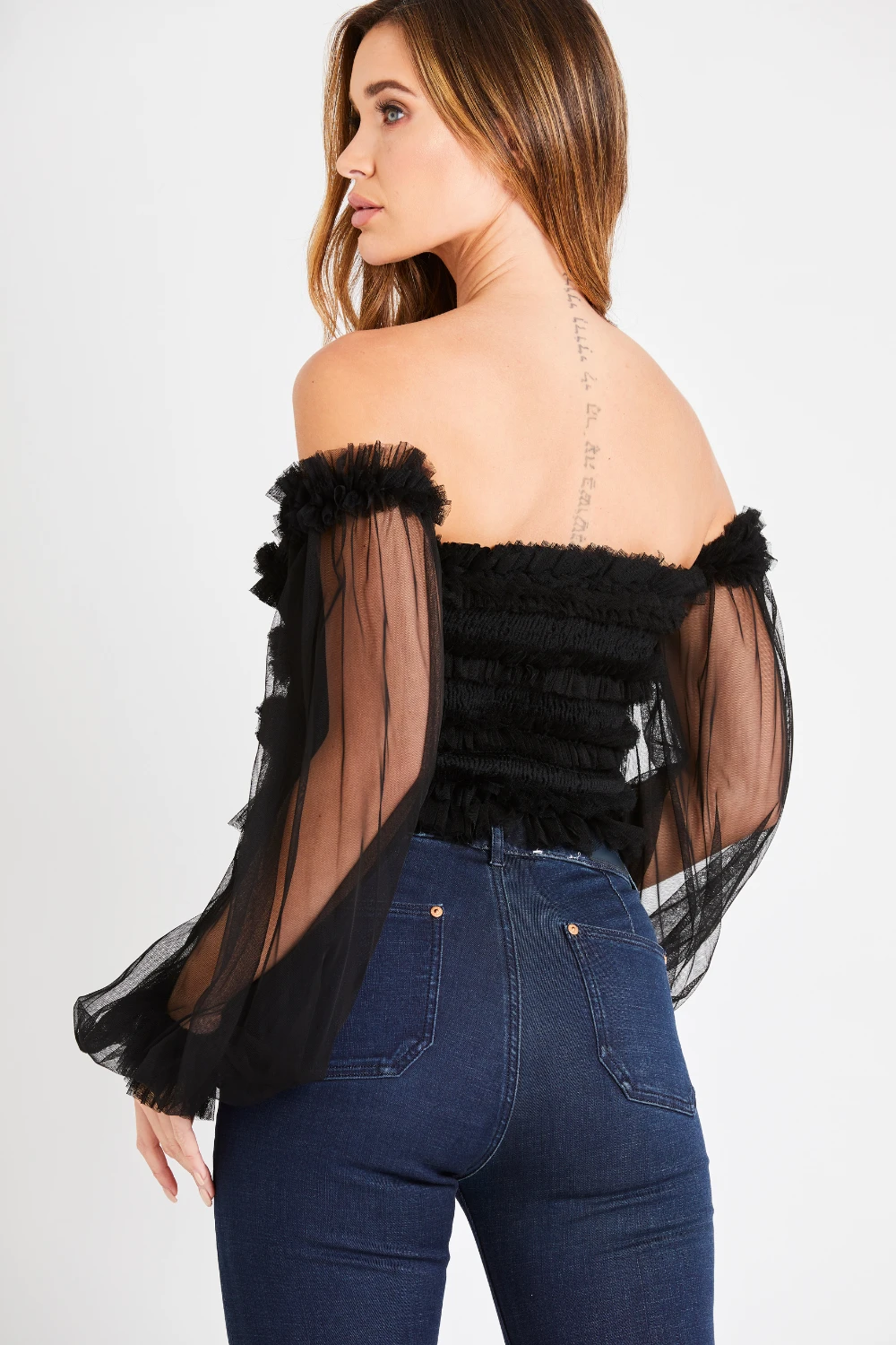 Lace & Beads Rolf black tulle top has gorgeous ruffle detailing and statement sleeves making this the it-top you have to have.Â