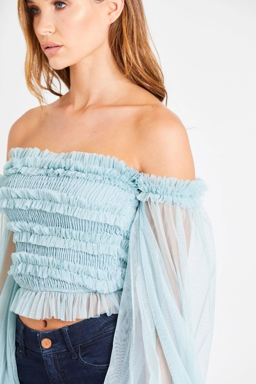 Lace & Beads Rolf Top in Teal. Off the shoulder mesh top with beautiful tulle ruffles. This gorgeous teal top is the perfect brunch top with it’s statement sleeves and ruched body. Perfectly paired with shorts or jeans.