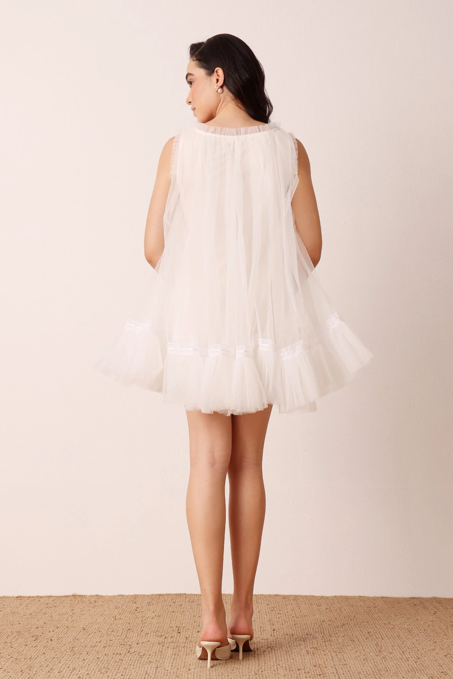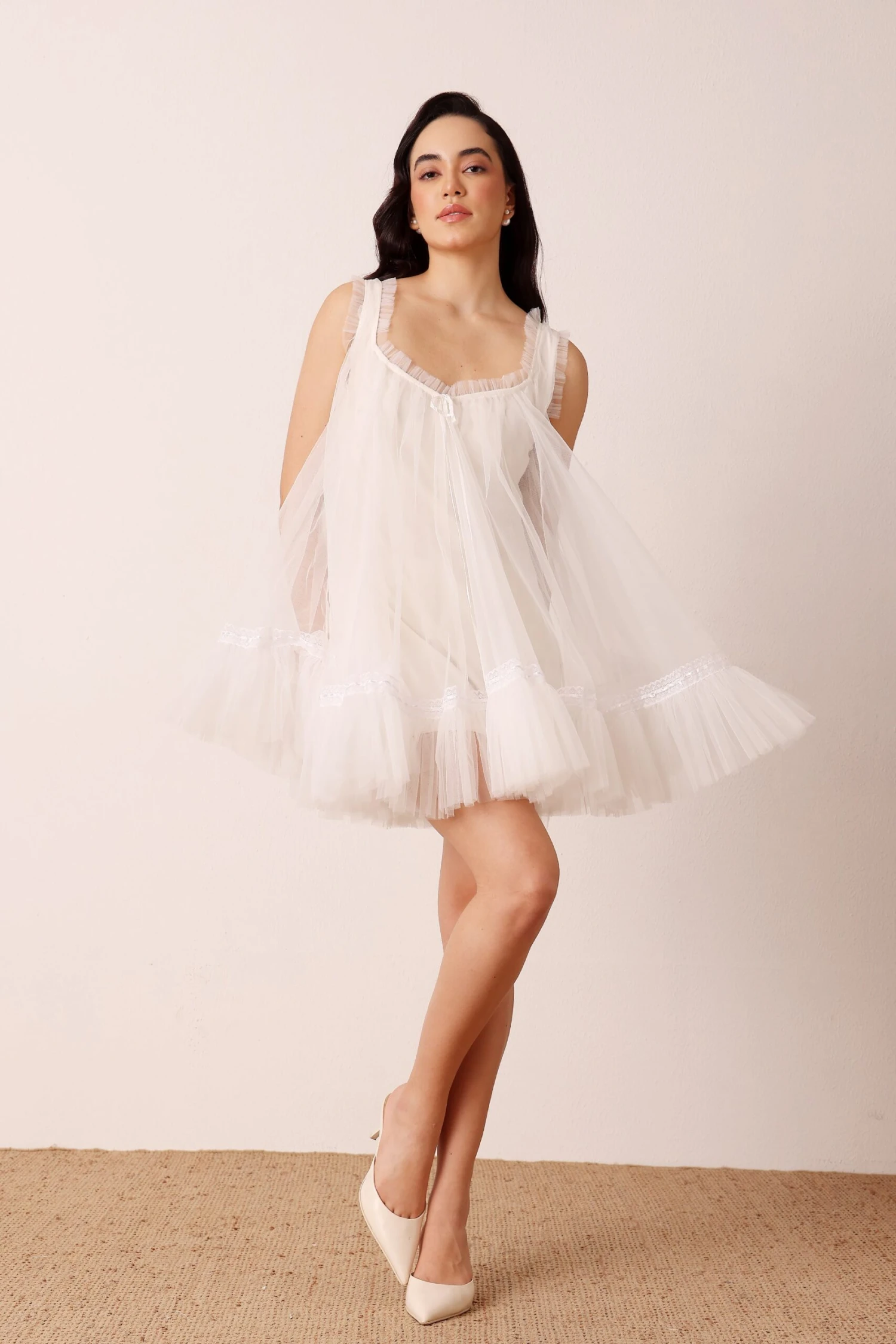 Lace & Beads Sadie Mini Dress in Buttercream. Sweet and soft with a vintage edge, the Sadie Mini Dress in Buttercream captures the magic of modern femininity. Designed with a delicate tulle overlay, this piece features a flattering V neckline, dainty satin ribbon detail and gentle lace trims that frame the hem. The light buttercream tone adds a romantic glow, making it the perfect choice for daytime moments or candlelit evenings.