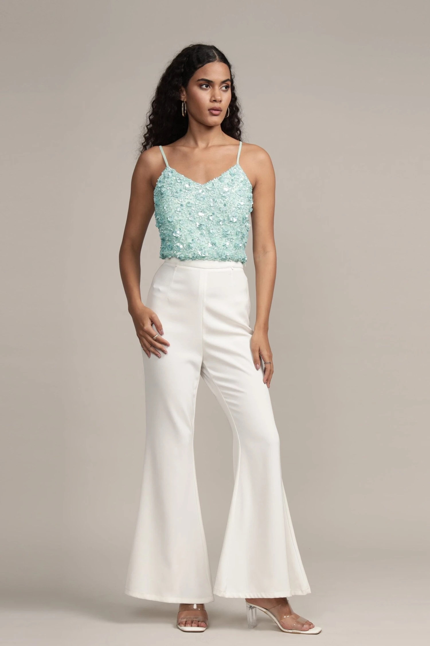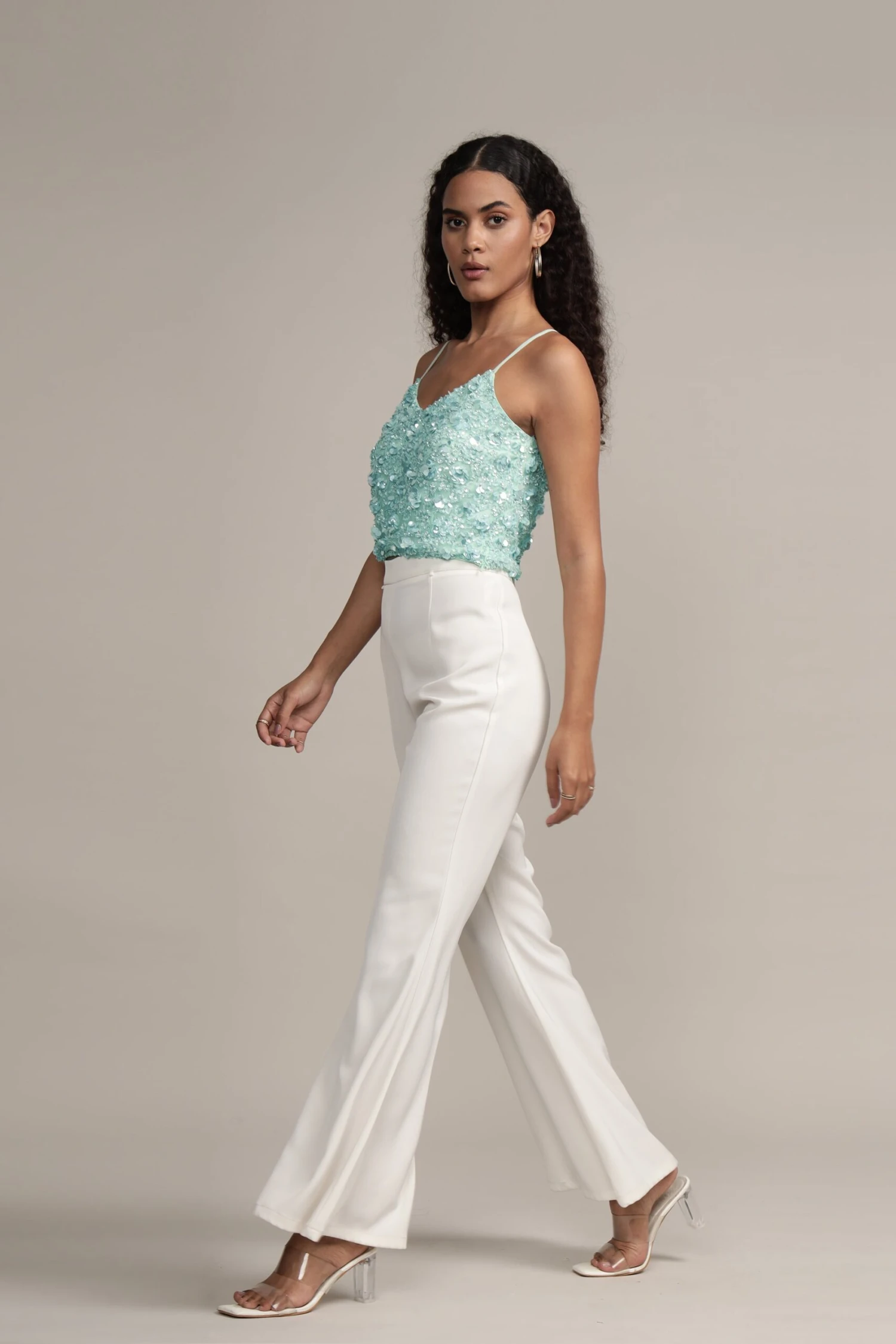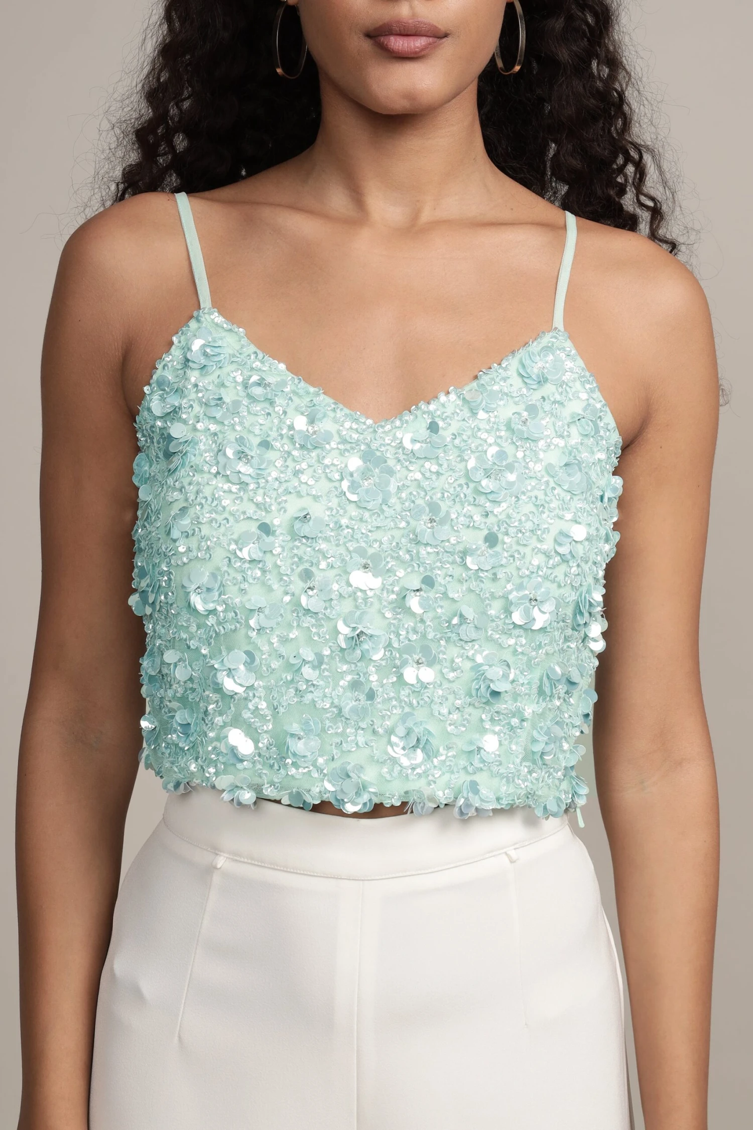Lace & Beads Sandy Sequin Cami Top in Aqua. This embellished top is adorned with shining aqua sequins. The V-neckline and adjustable straps pair perfectly with soft white linen trousers for a day time look, or leather trousers for your cute next date night.