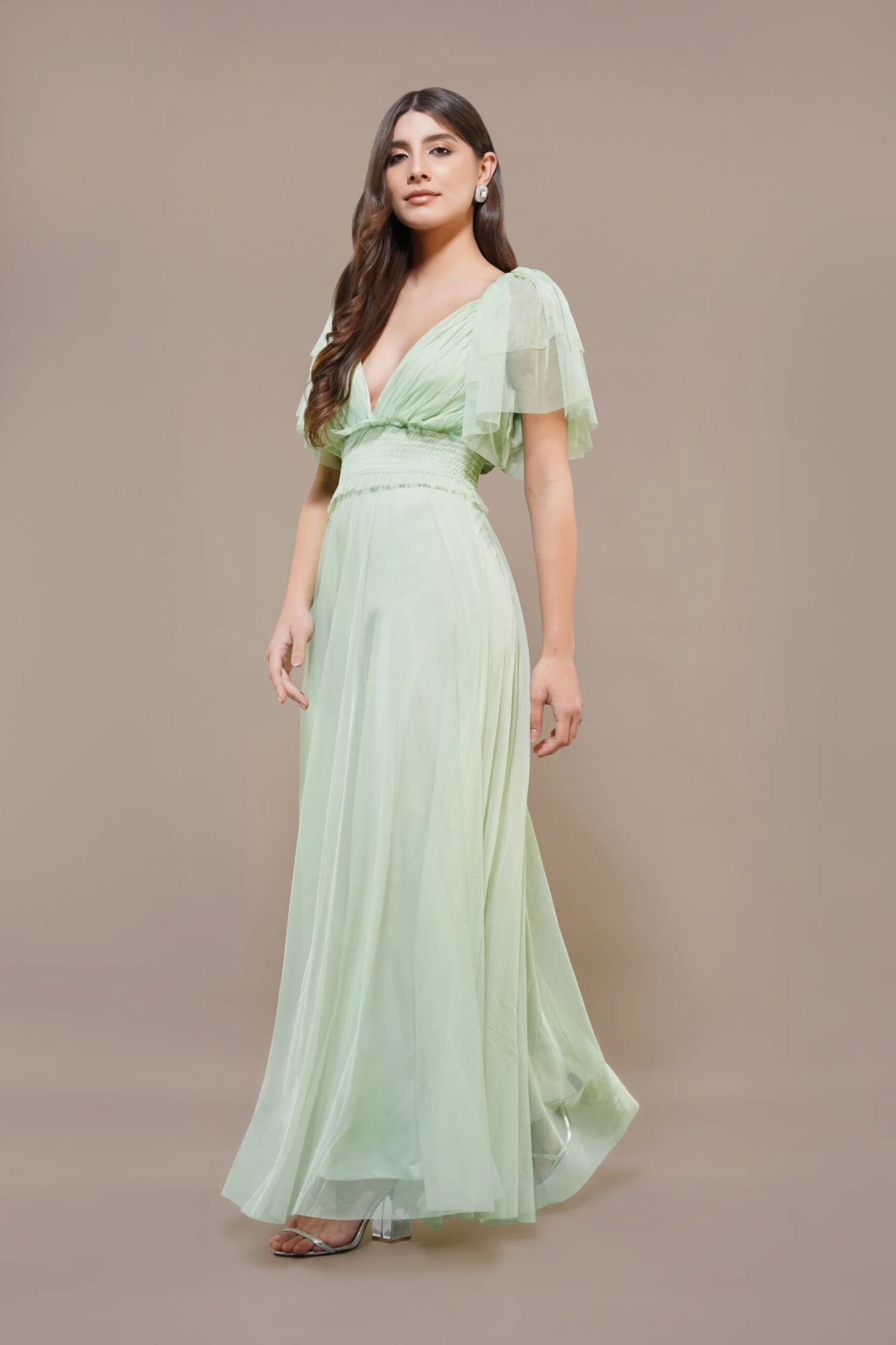 Lace & Beads Shelby Maxi Dress in Sage Green. This is a dreamy, floor-sweeping gown designed for effortless elegance. Featuring a deep V-neckline, delicate layered flutter sleeves, and a cinched, smocked waist. This dress is comfortable and easy to wear, while also enhancing your silhouette. while exuding romantic charm. Our Shelby Maxi dresses are perfect for weddings, formal events, special occasions and holidays.