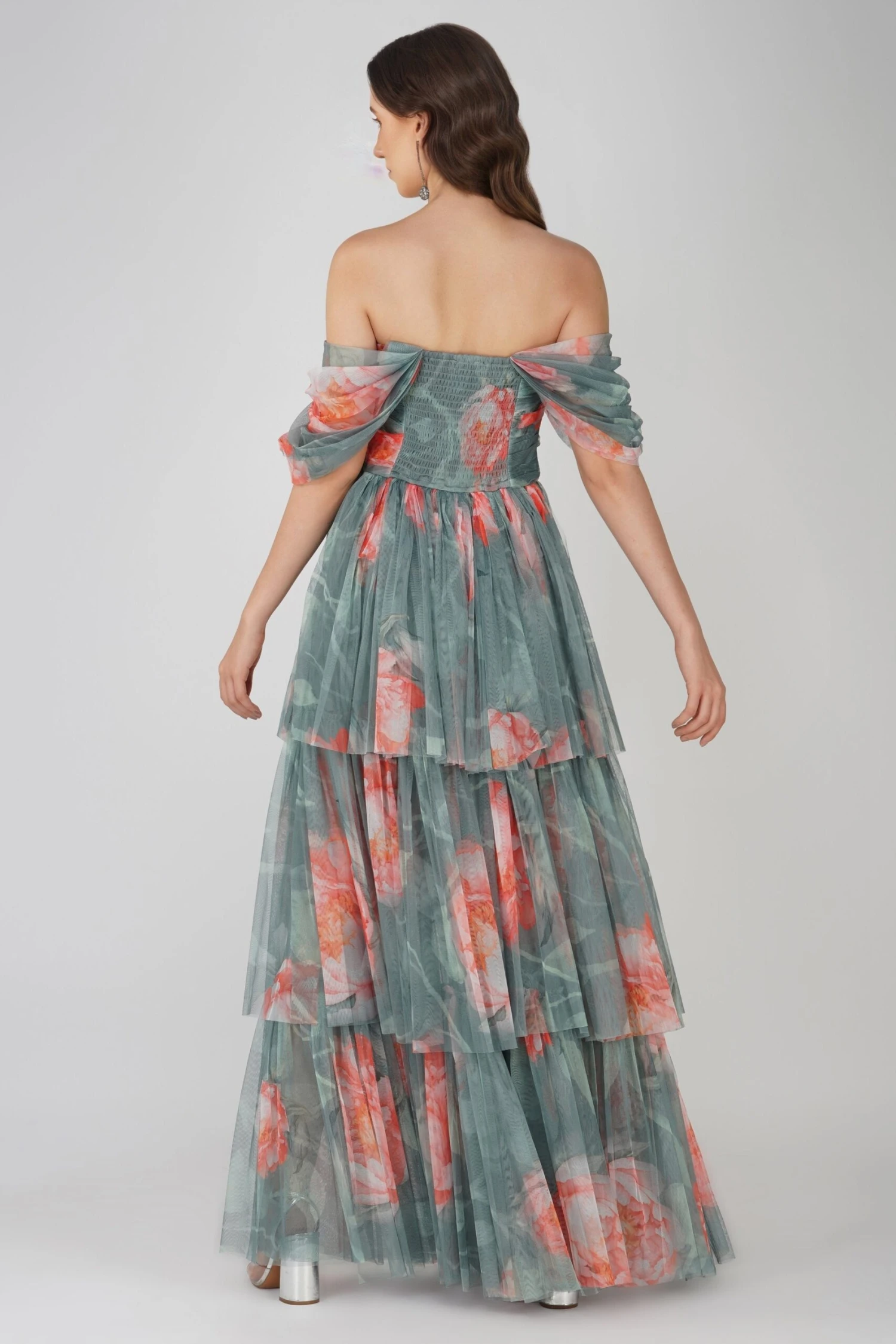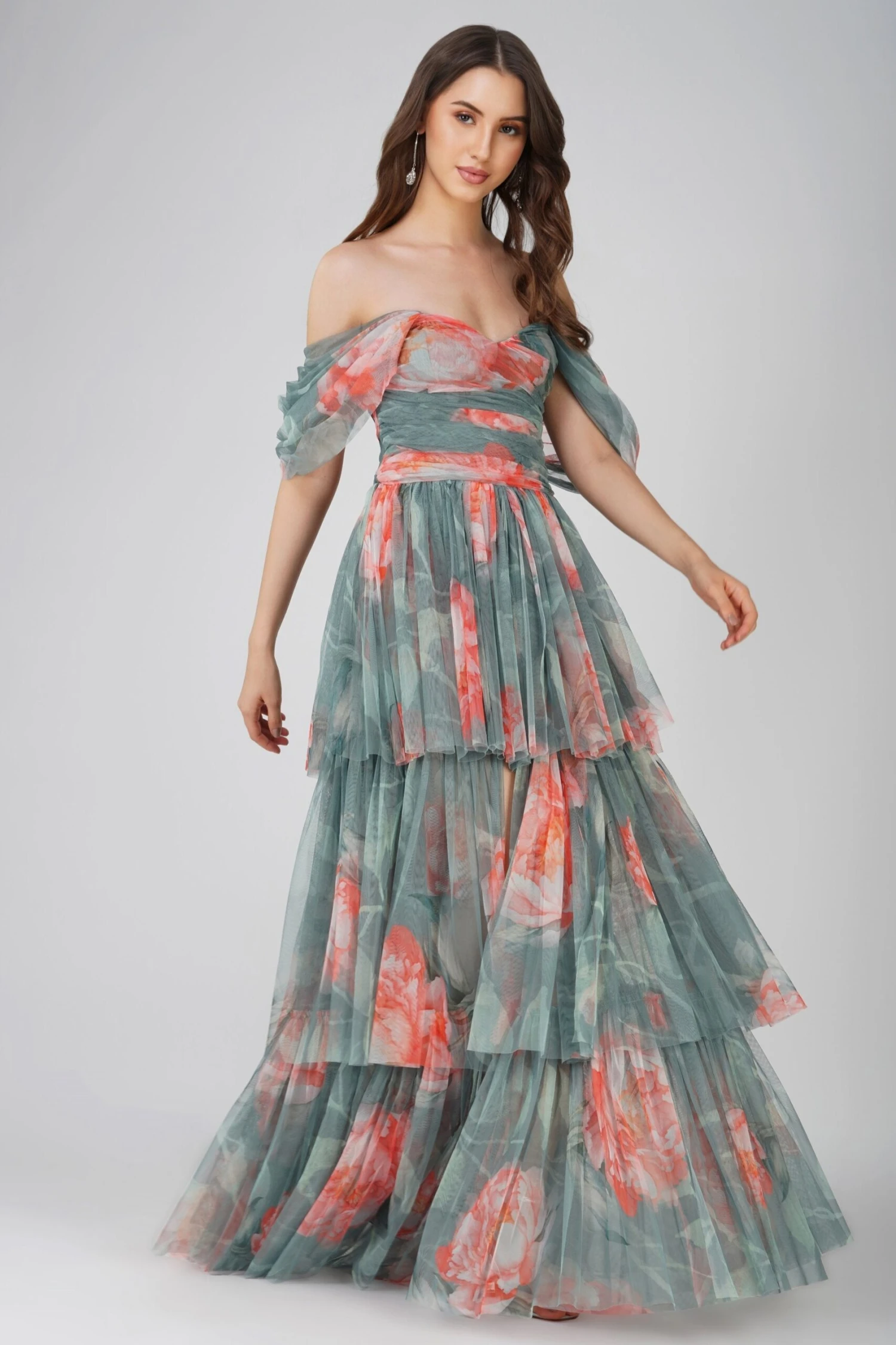Designed with a green floral print throughout the dress. This dark sage tulle dress is the stand-out dress you have got to have! From the stunning contrast print to the voluminous tulle skirt – this is the ultimate princess dress. Make your dramatic entrance with this floral maxi dress whether you are looking for a wedding guest dress or a dress for a special event.